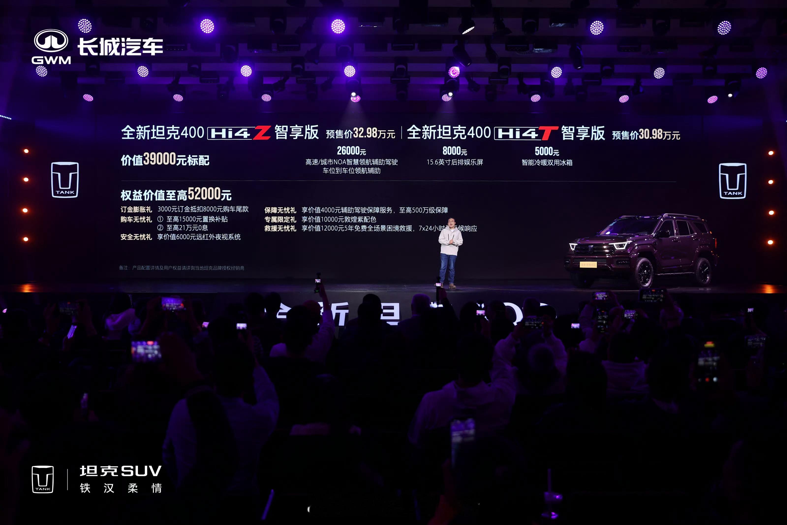 全新坦克400正式预售坦克400 Hi4-Z智享版预售32.98万,Hi4-T智享版30.98万,这是它第二款搭载Hi4-Z技术的车型。车顶激光雷达配上多角度摄像头,搭配第三代Coffee Pilot Ultra系统,城市NOA和高速NOA都能搞定,智能化表现跟主流新能源品牌差不多,CLTC纯电续航有200公里。正式价格会是多少?猜猜看~[偷笑][偷笑][偷笑] 大v聊车自驾游