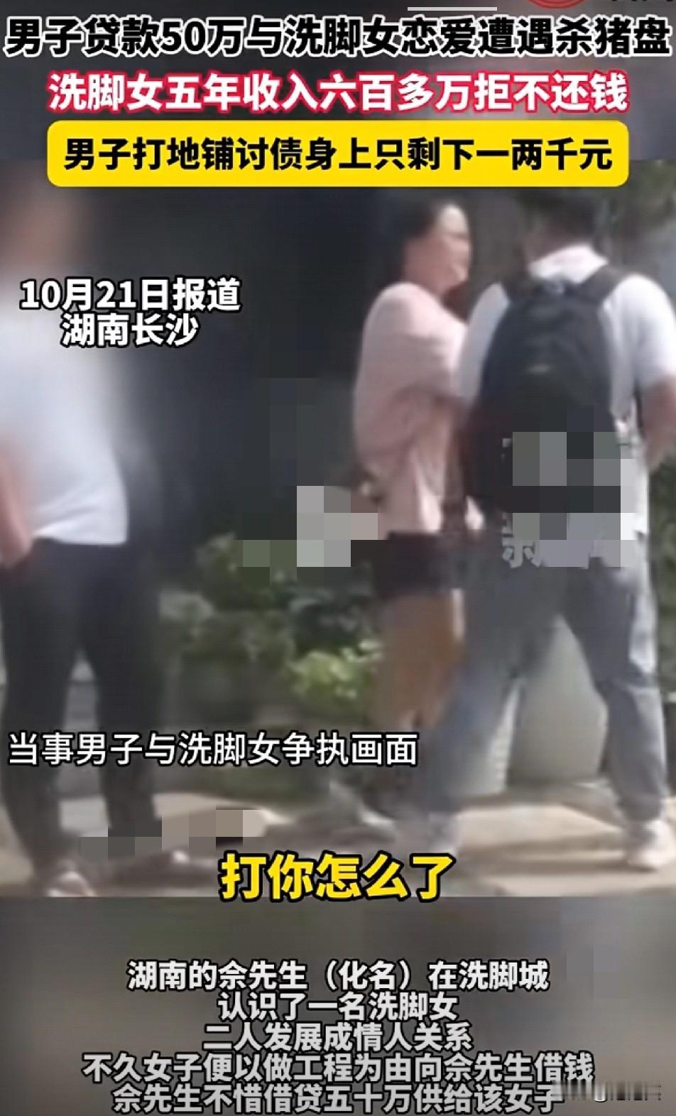 炸裂 湖南佘先生(化名) 在洗脚城认识一女子,恋爱后对方以做工程为由借钱,他不惜贷款50万给她 结果发现是杀猪盘,那女的五年收入六百多万,却拒不还钱 佘先生现在打地铺讨债身上就剩一两千元 你们身边是不是也有因为感情上头就盲目付出的人 这事是提醒咱恋爱要清醒,还是该骂骗子没良心 要是你遇到这种“恋爱杀猪盘”能及时止损吗