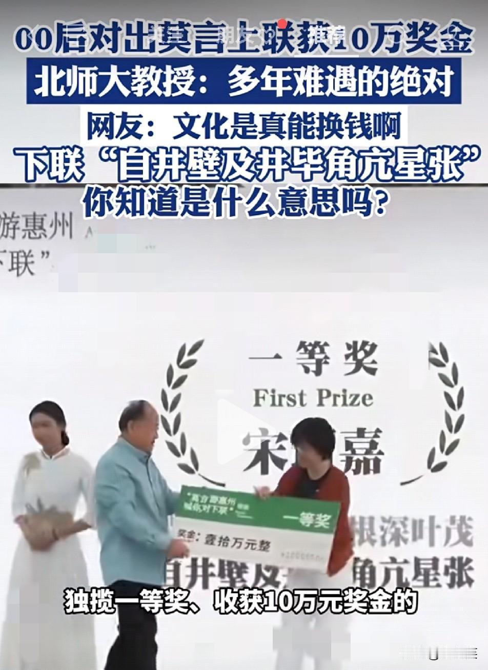 绝了 00后对出莫言上联获10万奖金 北师大教授 多年难遇的绝对 莫言在广东惠州客家围屋碧滟楼写下上联“从南阳到南洋根深叶茂” 一位00后对出下联“自井壁及井毕角亢星张”,独揽10万元奖金 热评有人狂赞:“00后文化人太牛,这钱拿得服!” 当年轻人把传统文化玩出花,这到底是文化传承的新路子,还是对经典的“创新” 这事是该夸00后有才,还是该担心对联文化被玩变味?