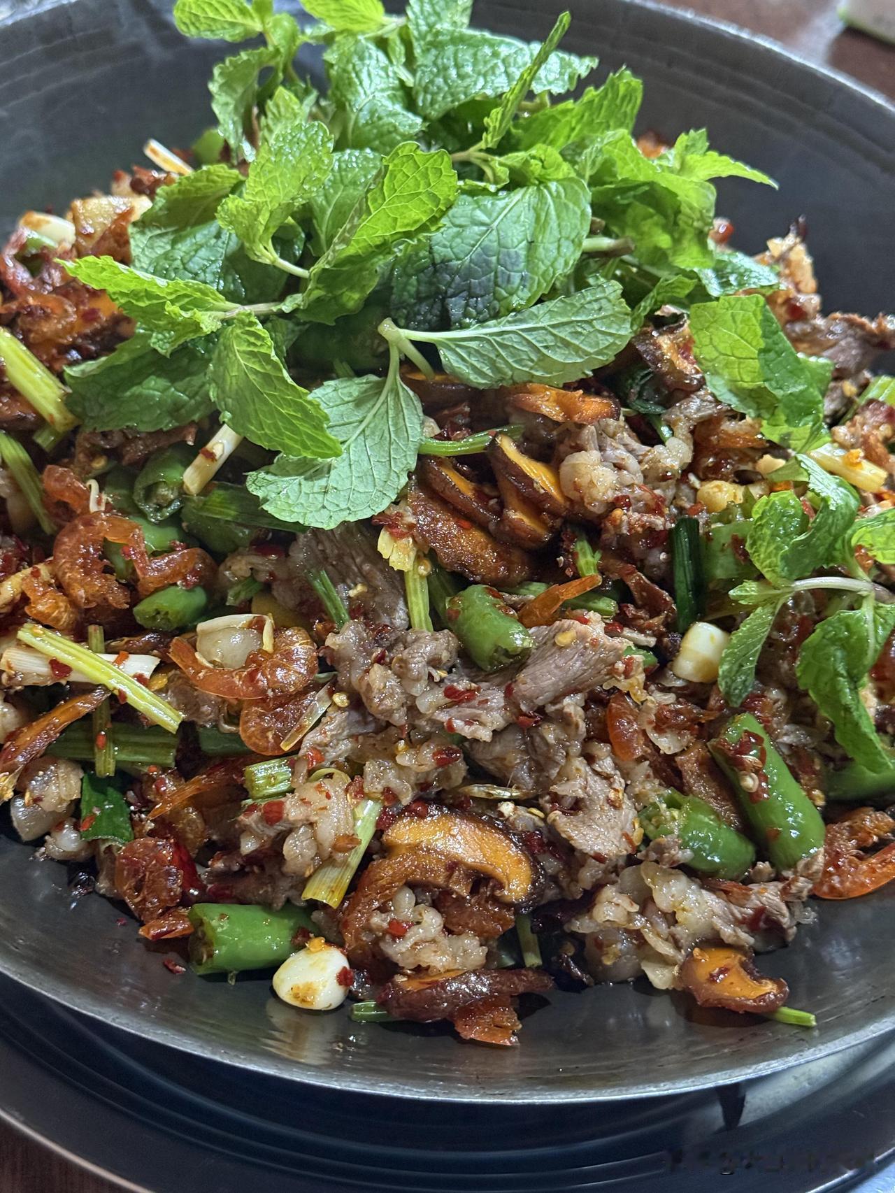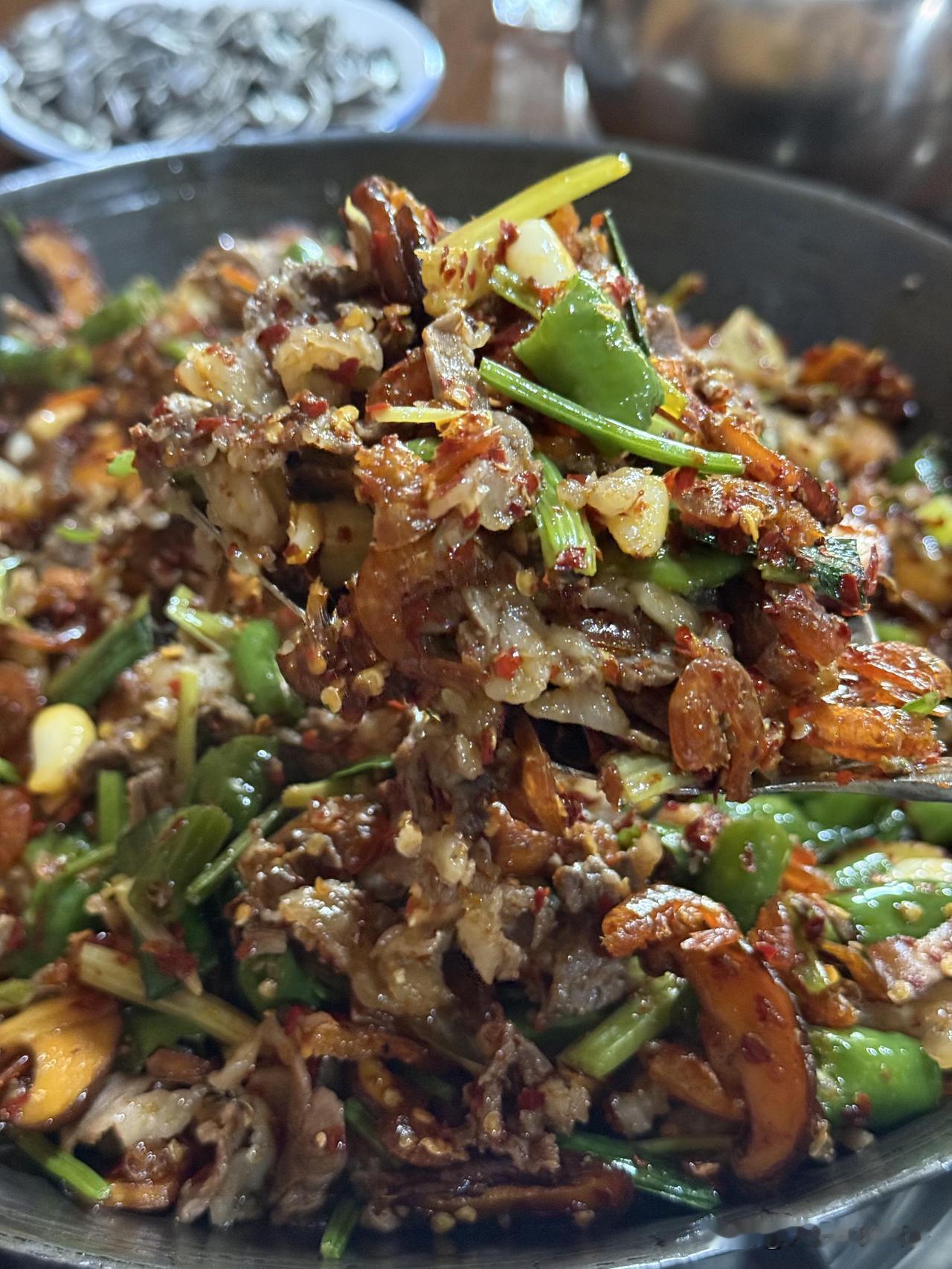 曲靖干锅牛肉!有“亿”点点震撼!!有特色的干锅牛肉,肉片很薄,搭配了很多虾米香