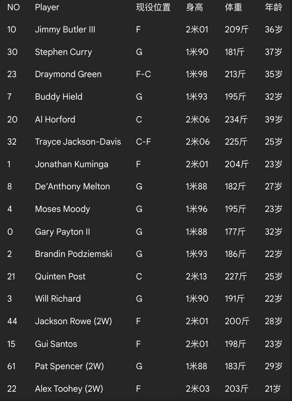 勇士官方发布新赛季首场比赛的阵容全览,我做了一个中文版,方便大家查看库里体重不是