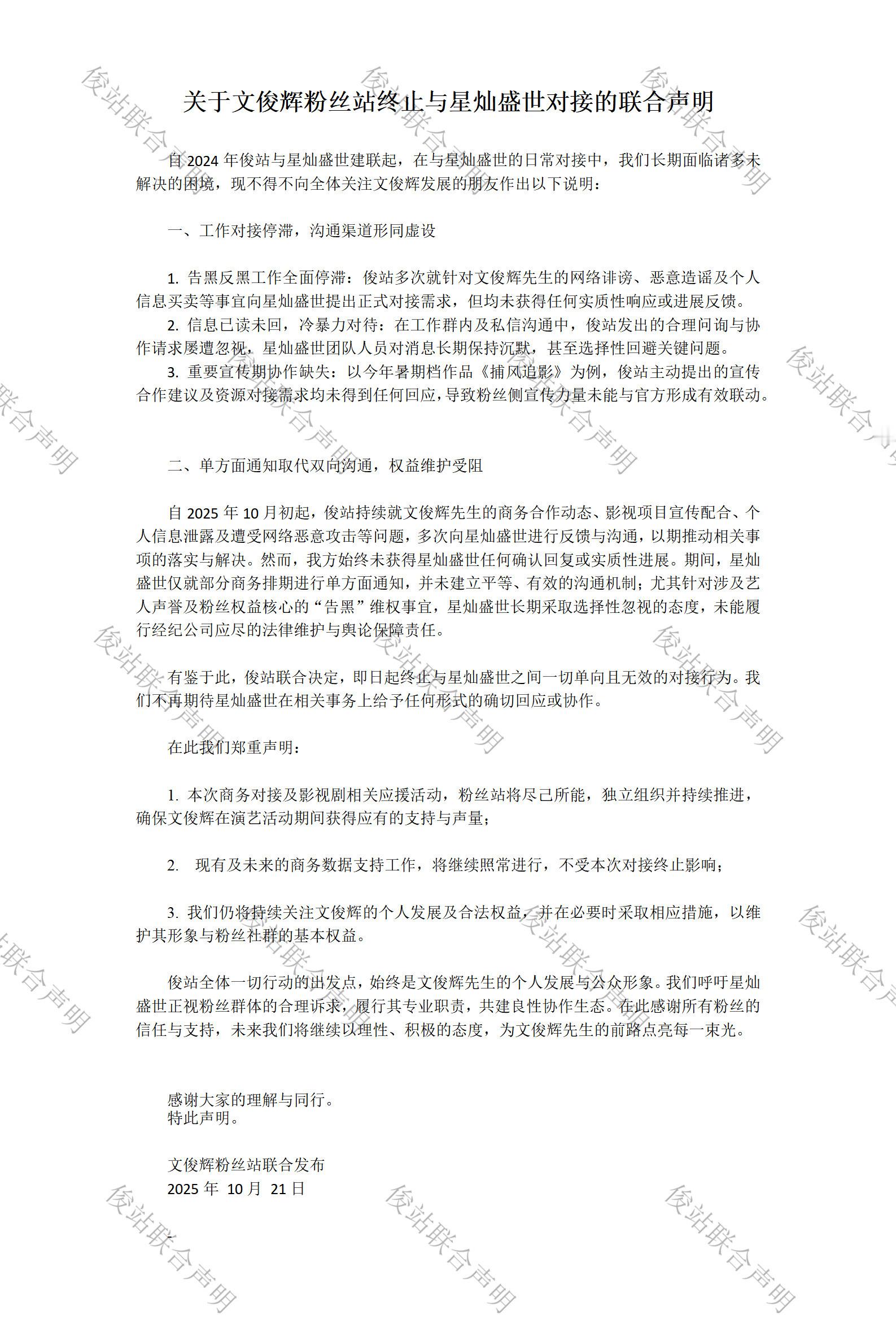 文俊辉粉丝站终止与公司对接 文俊辉粉丝站发声明,终止与公司星灿盛世对接,结束无意义工作。以后将继续独立组织应援、支持商务数据,并持续关注艺人个人发展。