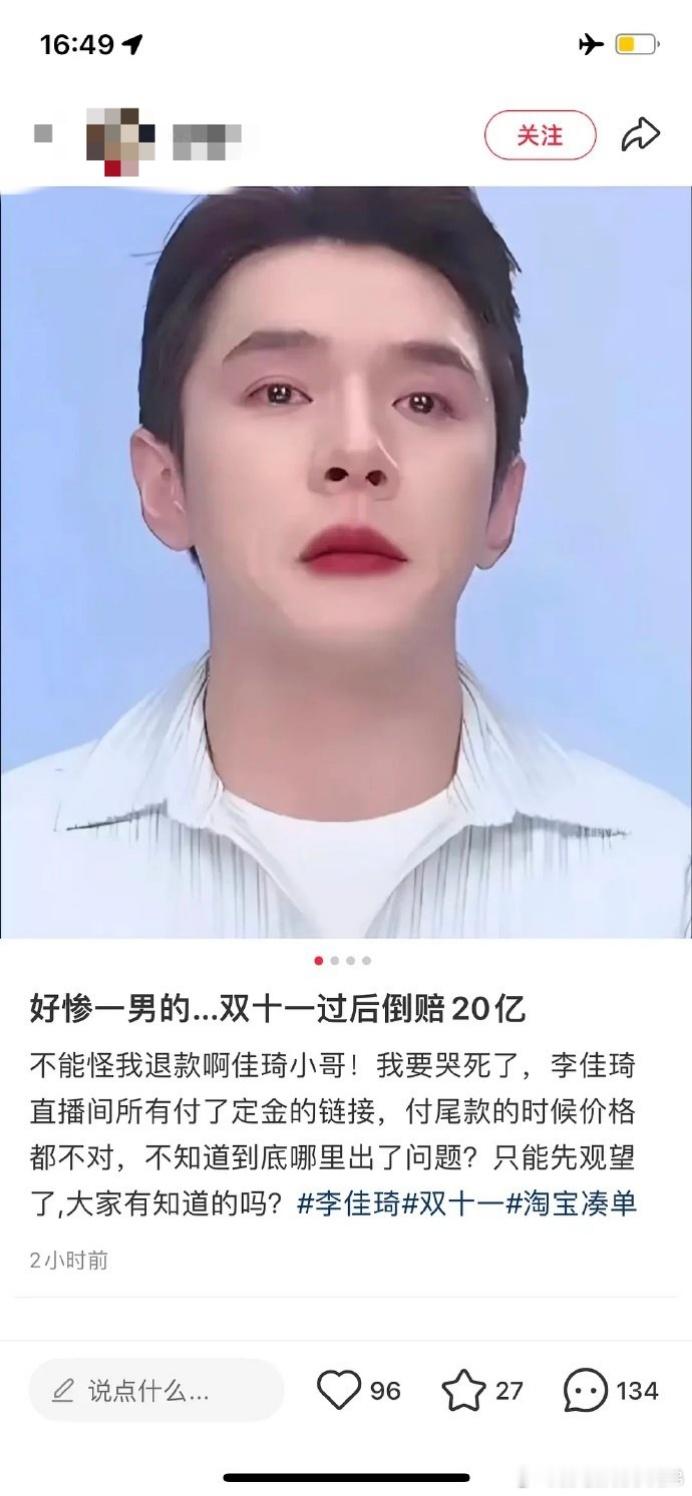 网友在心疼李佳琦为啥心疼李佳琦为啥啊??心疼李佳琦?