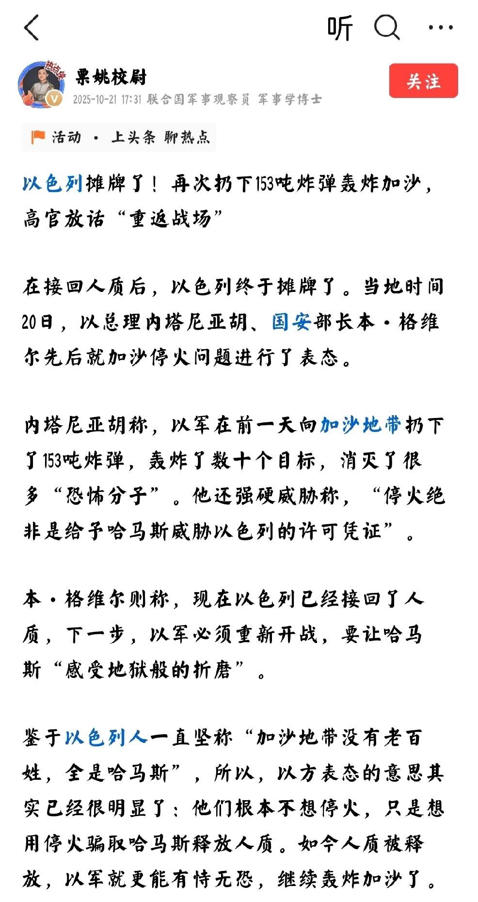 国际热点:昨晚国际非常热闹 个人观点:以色列重燃战火:抛下153吨炸药,轰炸加沙;乌克兰,想结束俄乌战争;黄金大跌。 这些表面的热点说明,国际结构力量在发生着不易察觉的隐秘深度改变。 以色列重新轰炸加沙,是情理之中的事情。乌克兰突然想结束俄乌战争,颇有些让人意外。黄金大跌,说明有人未卜先知。 乌克兰想停战的想法,略显天真,一个傀儡总统,一个代理人国家,能是想停就停的吗?西方利益,谁能保证?美国利益如何保障?欧盟利益如何保障?