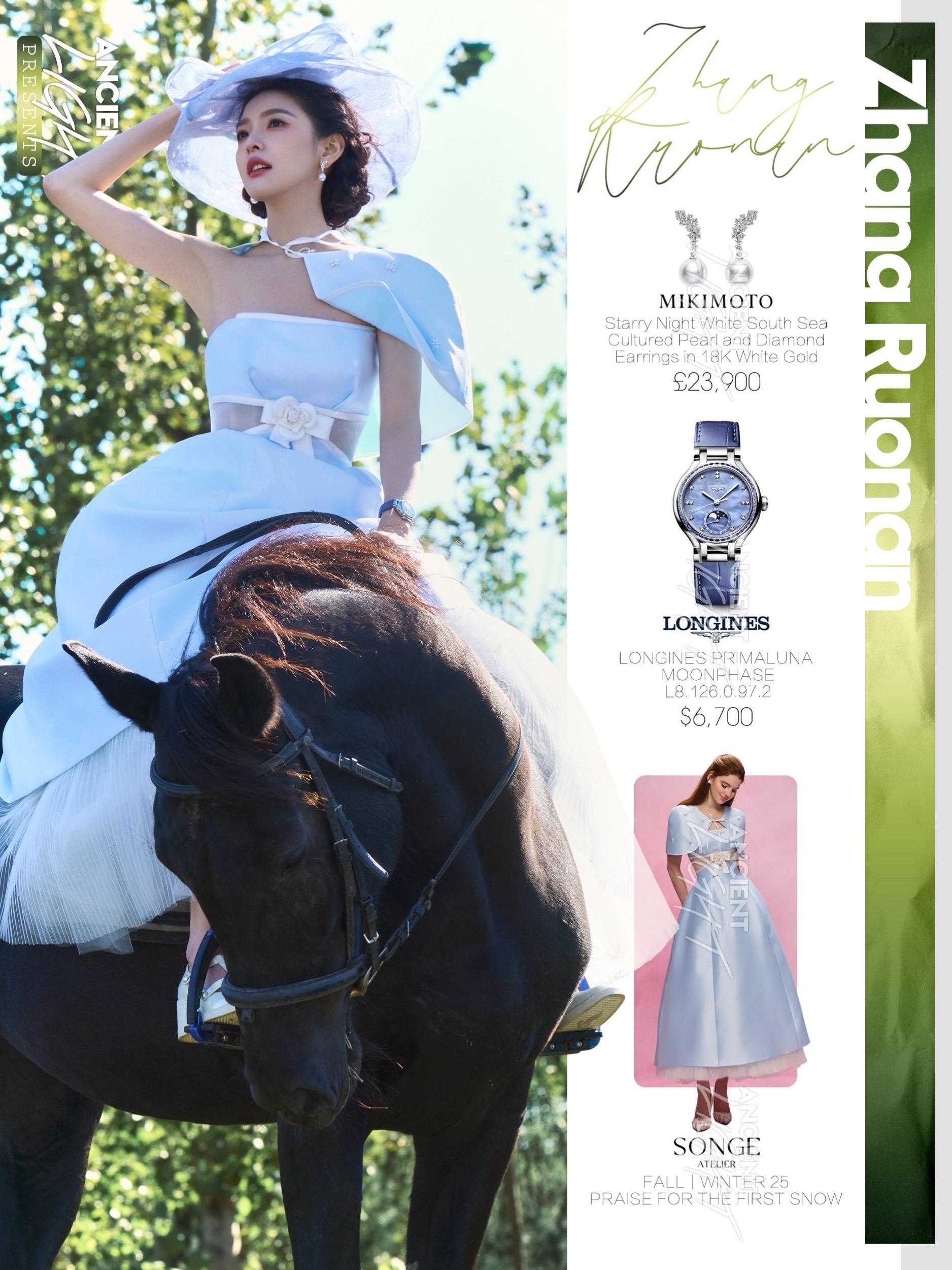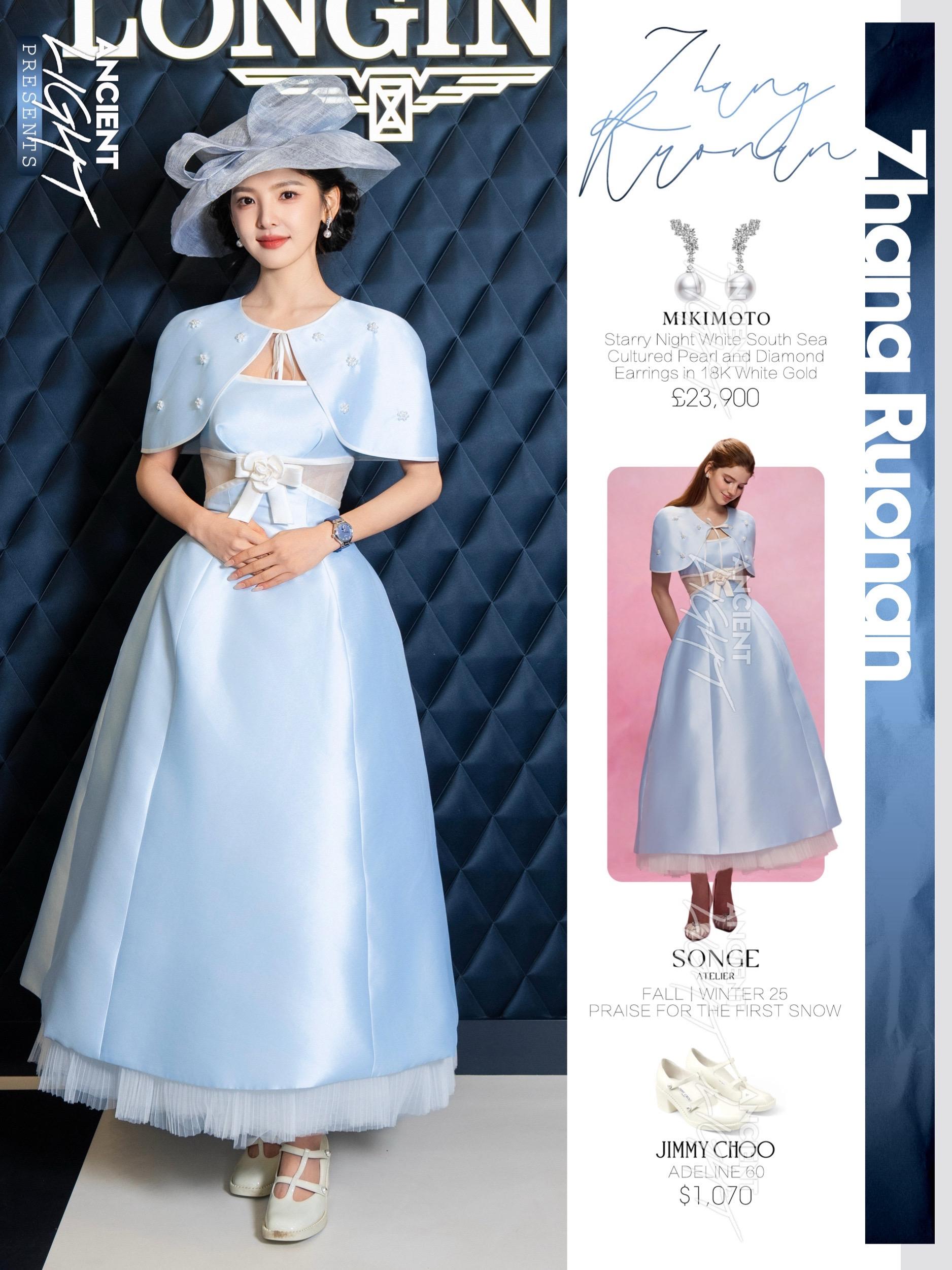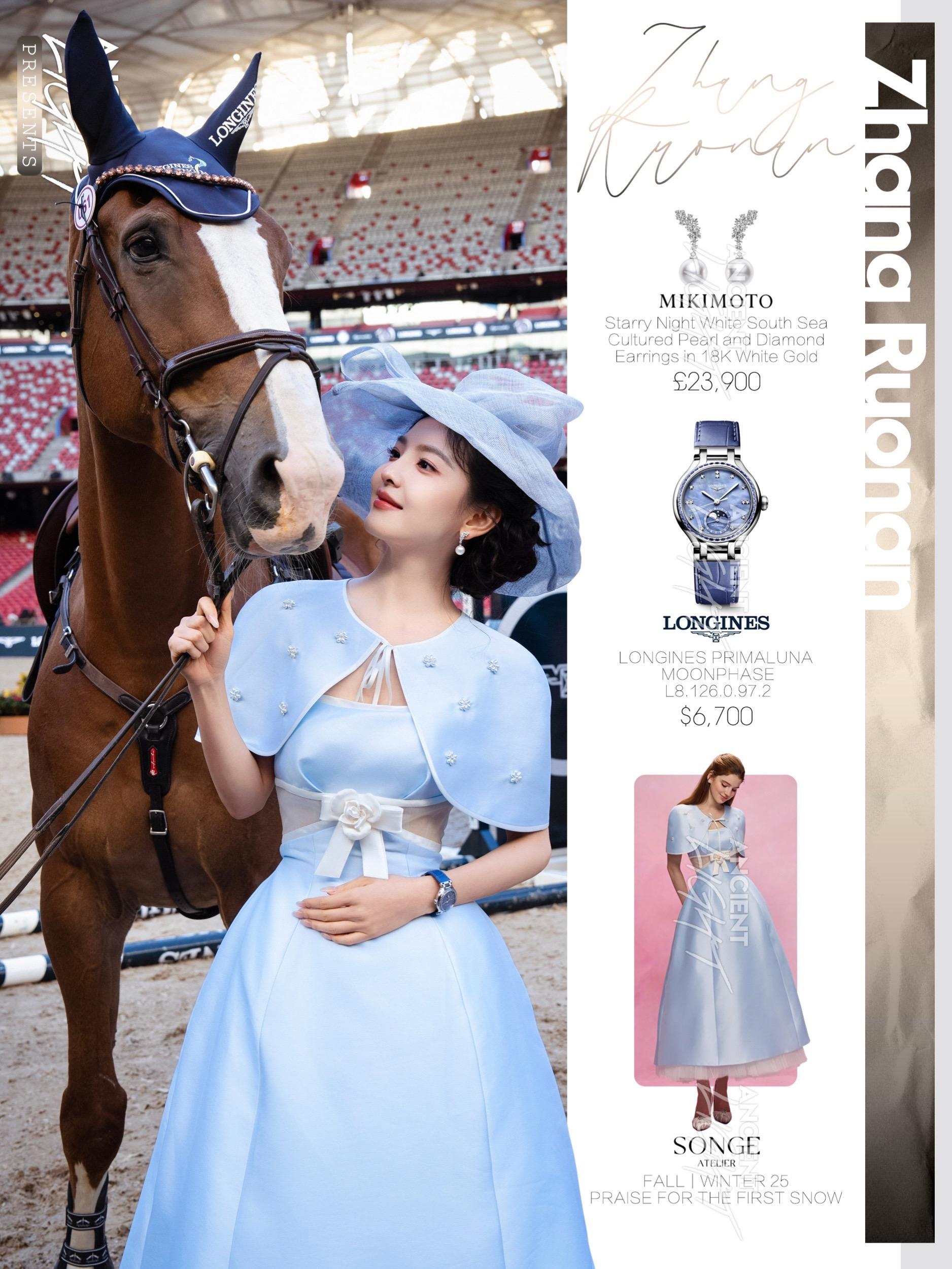优雅同频,定格下每个闪耀瞬间✨。章若楠以品牌大使身份出席第十二届浪琴表北京国际马术大师赛,身穿SONGE浅蓝色缎面复古裙,搭配网纱礼帽、珍珠耳环及浪琴心月系列腕表,每一次跃起的弧线,都是精准、优雅与力量的融合。