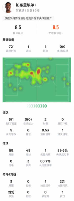 欧冠联赛阶段第3轮,阿森纳主场迎战马竞,加布里埃尔首发出战,传射建功,送出1次关键传球,还有3次解围,2次争顶均成功,评分8.5。