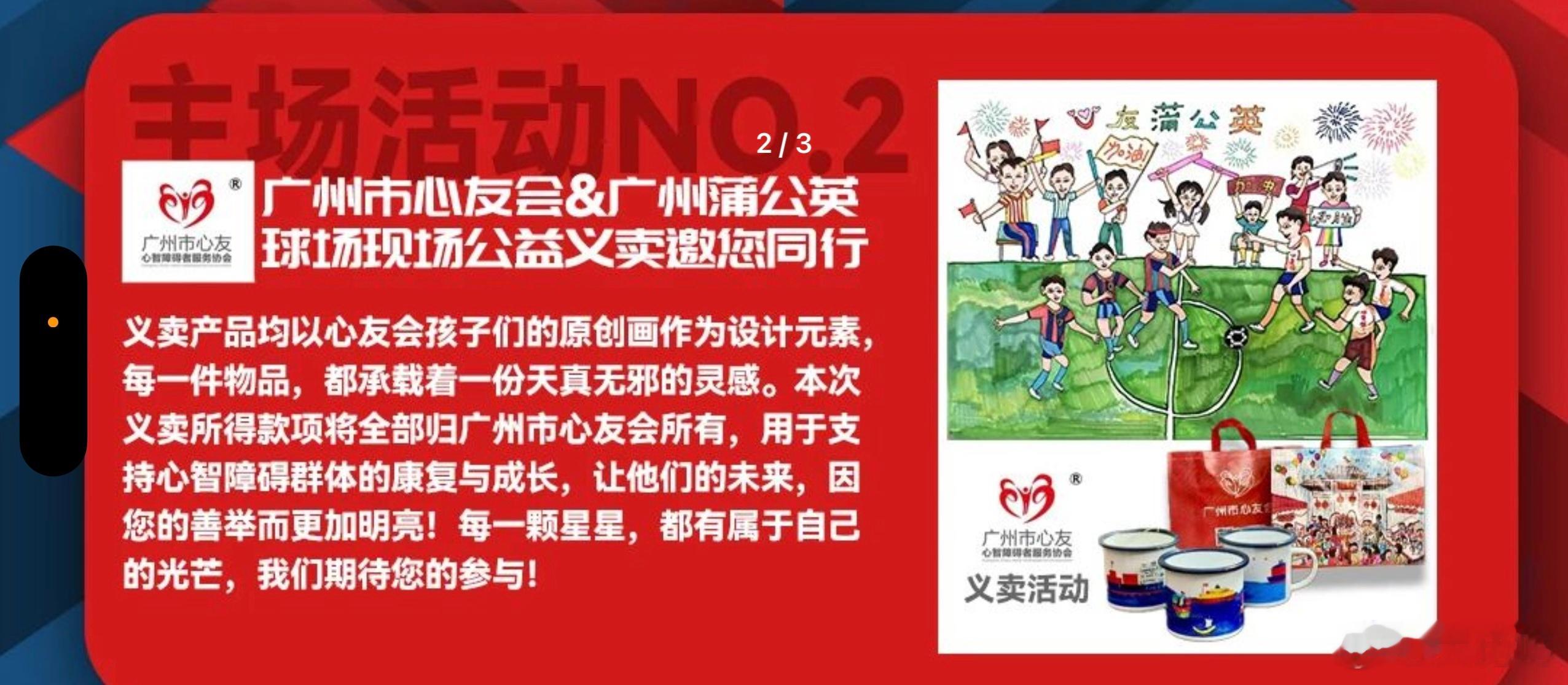 【活动2】广州蒲公英德桦绿建赛季收官战已开票,这场主场比赛安排多项活动多样福利供广大球迷享受,昨天介绍了“活动1”,今天重点推荐第二个活动:广州市心友会&广州蒲公英球场现场公益义卖活动!