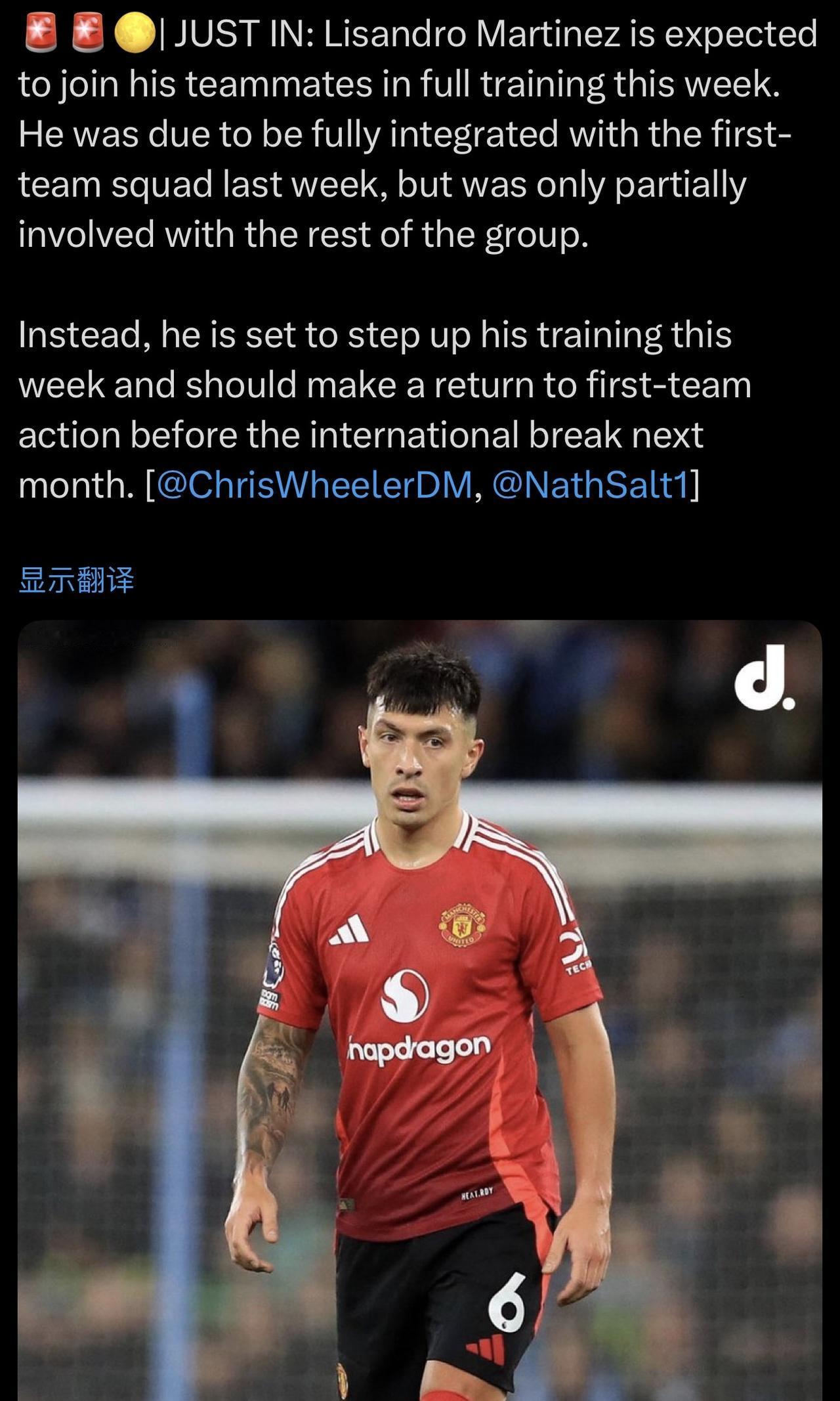 最新消息:利桑德罗·马丁内斯预计将于本周与队友一起进行全面训练。 🔴他原本计划