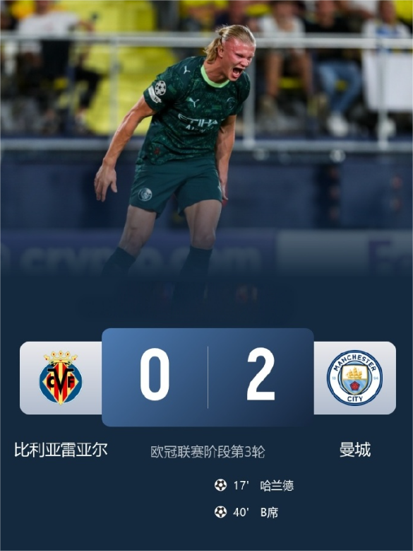 欧冠联赛阶段第3轮,曼城客场2比0战胜黄潜。哈兰德连续12场破门,B席建功。 ​​​​