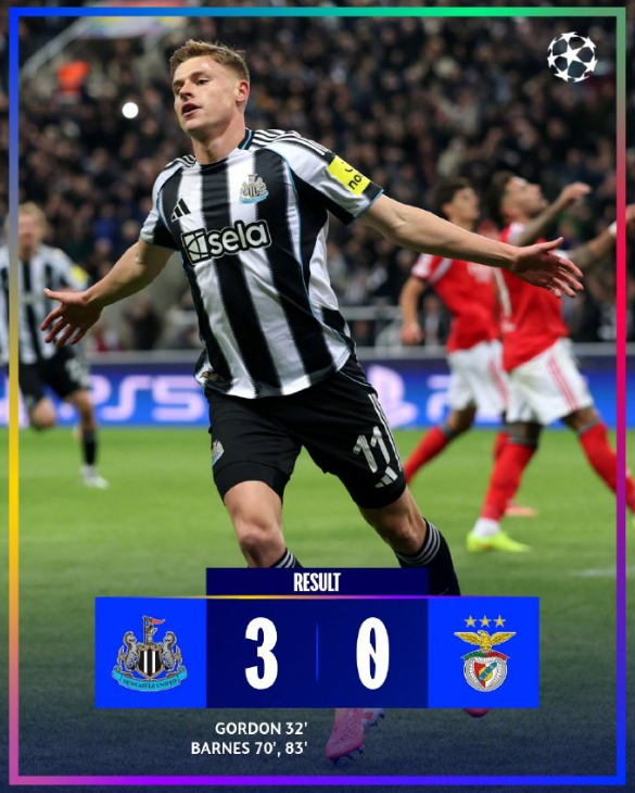 戈登率先破门,哈维-巴恩斯独中两元,纽卡斯尔联3比0战胜本菲卡!