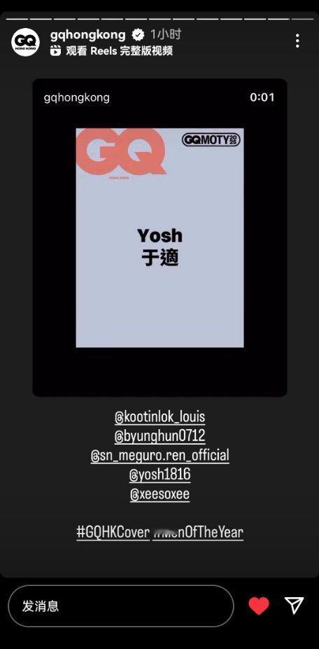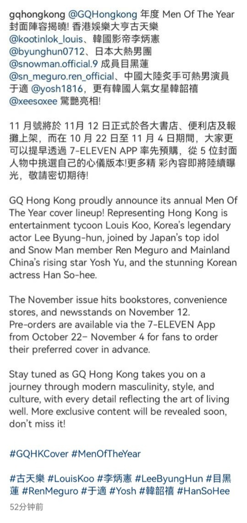 于适GQ港版封面预告,惊喜亮相创刊第二期封面物料,成为首位登上该封面的内地面孔,与古天乐、李秉宪、目黑莲、韩素希等一众亚洲顶流星光齐聚,可见封面含金量🎉