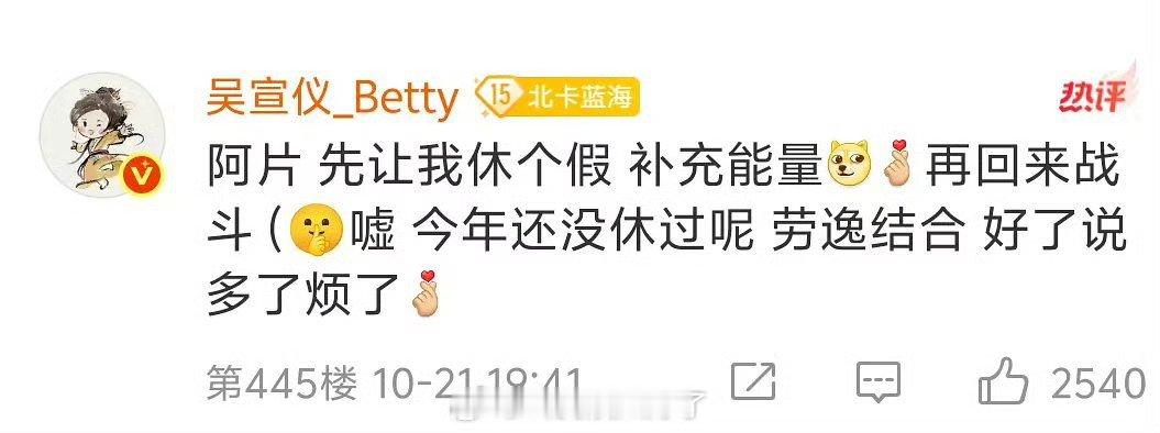 粉丝评论工作室给吴宣仪接好戏,吴宣仪评论区回复:先让我休个假,补充能量,今年还没休过呢