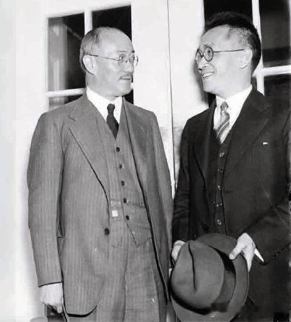 1938年9月美国华盛顿哥伦比亚特区双橡园驻美大使官邸,准备卸任的55岁驻美大使王正廷(左)与准备接任的46岁驻美大使胡适历史影像