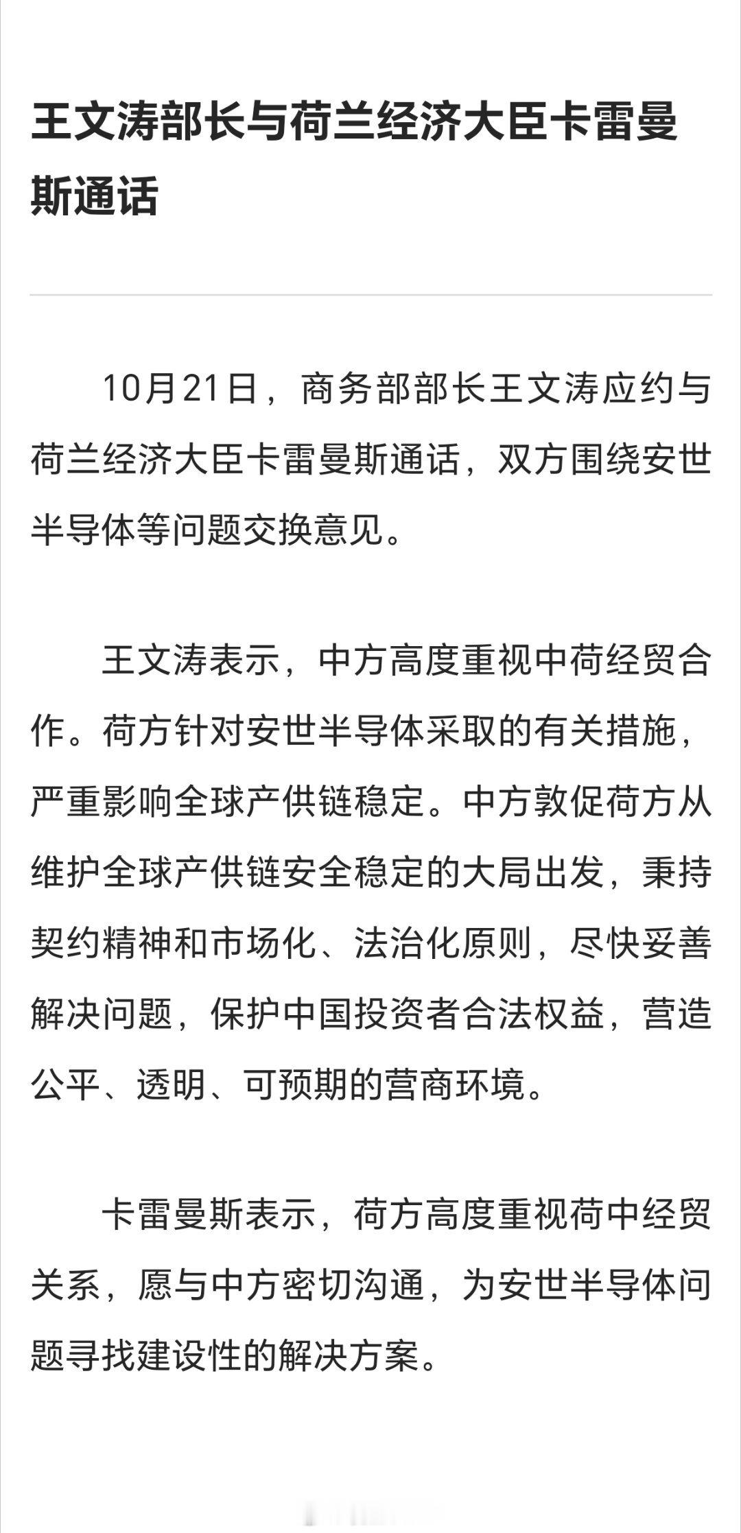 商务部部长王文涛与荷兰经济大臣通话10月21日,商务部部长王文涛应约与荷兰经济大臣卡雷曼斯通话,双方围绕安世半导体等问题交换意见。