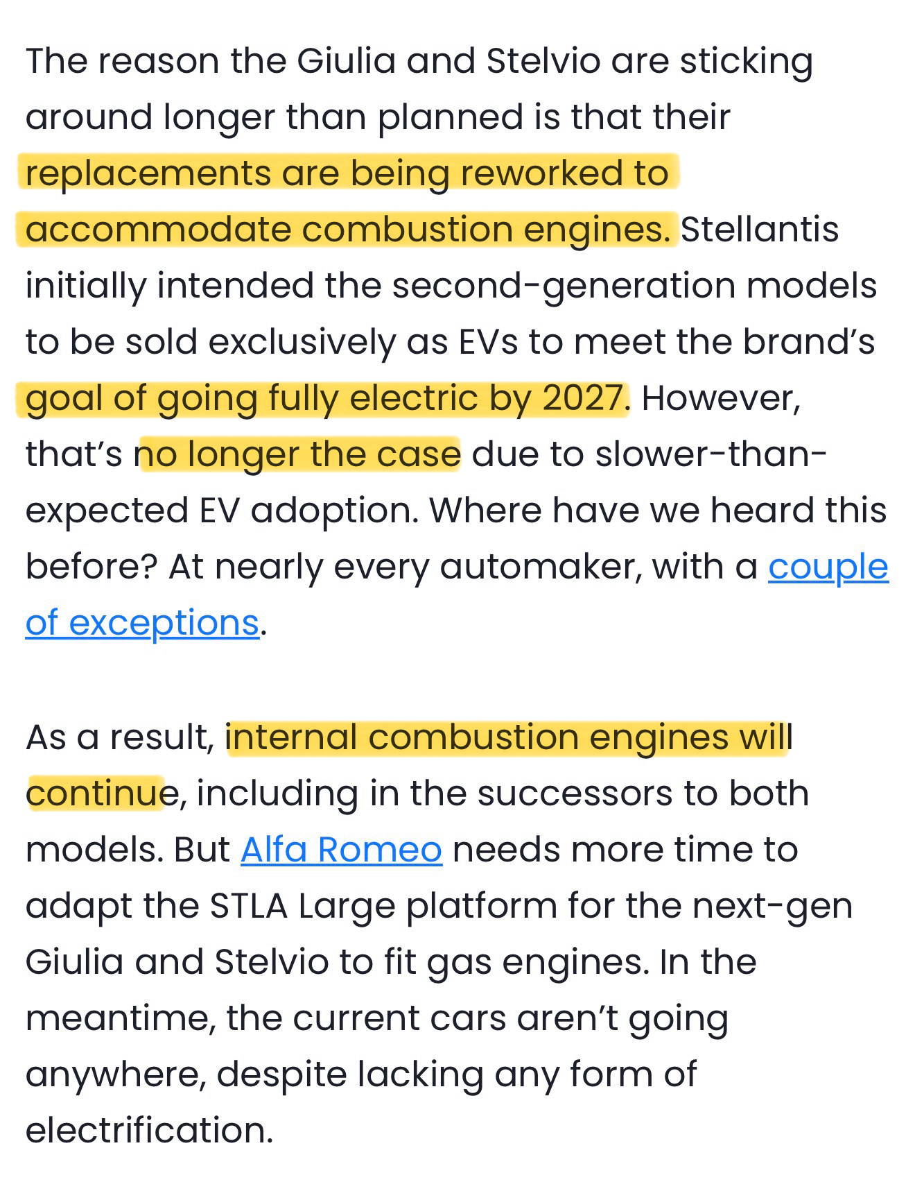 原因也很简单,阿尔法罗密欧原本打算在2027年转向纯电动,由于客户的反弹他们只好放弃这个计划。因此使用斯特兰蒂斯STLA平台的下代产品就要从纯电车变成油电兼顾(不排除和电Charger暴死有关[doge]),而喜欢放假和浓缩咖啡的意大利人还需要一些时间去兼容集团的内燃机。
