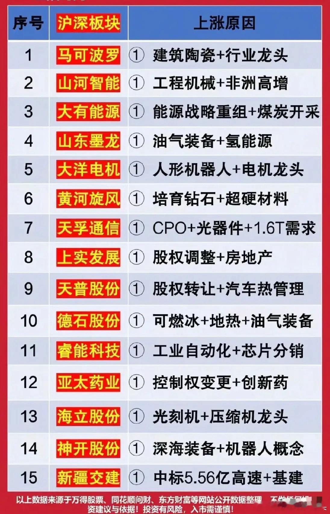 今天最火的个股覆盖建筑、机械、能源、科技、地产、医药等多个领域,上涨逻辑可分为三类:行业龙头+传统需求复苏(如建筑陶瓷、工程机械)、新兴赛道+技术布局(如人形机器人、光通信)、事件驱动+业务拓展(如股权调整、订单中标),反映市场对不同领域景气度与个股阶段性机会的关注。