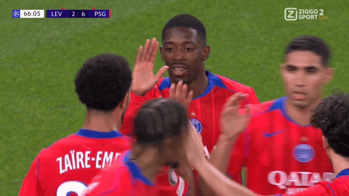 值得一提的是,下半场第63分钟,伤愈复出的登贝莱替补登场。仅3分钟过后,他便打入一球,也是他个人本赛季首粒欧冠进球。