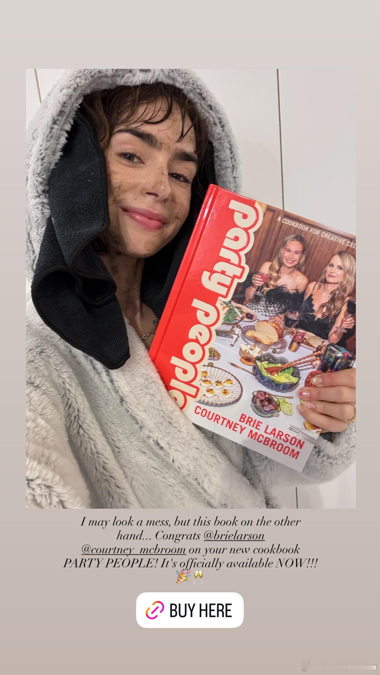 Lily collins莉莉柯林斯为合作新片《Close Personal Friends》同事Brie Larson的美食书《party people》打call宣传,莉莉正在为这部电影进行拍摄,好奇这一脸尘土的造型是什么剧情 ​​​