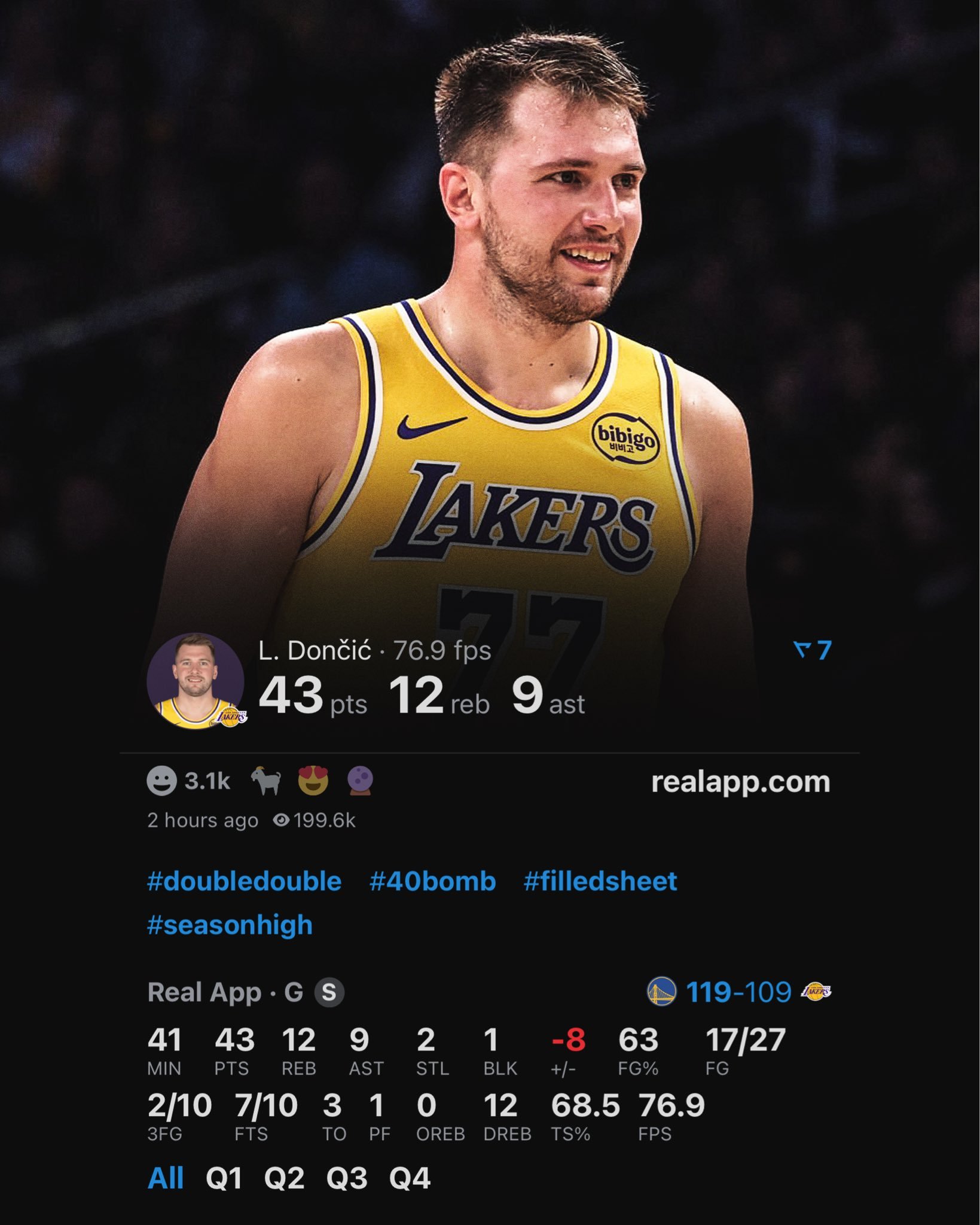 ——得到43分12篮板9助攻2抢断1盖帽