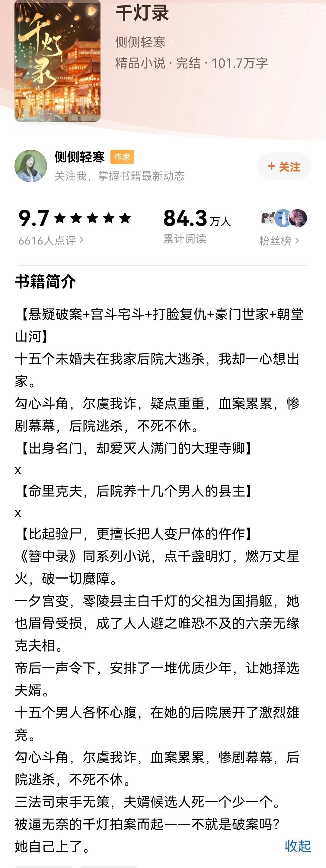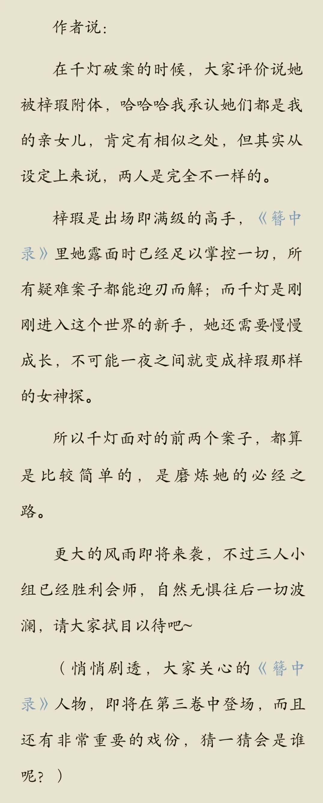 [种草R]作为《簪中录》的姐妹篇,难免会放在一起比较(第3部有写到关联)。这篇女主没有梓瑕聪慧,作者着重想写出千灯的成长线,两部都看过的老粉就会觉得案件更简单,当你押中男主猜出他的马甲,因为死者几乎都在候选人中,又猜中下一个死者,悬疑推理感又会大打折扣,仅个人观感,中强推。