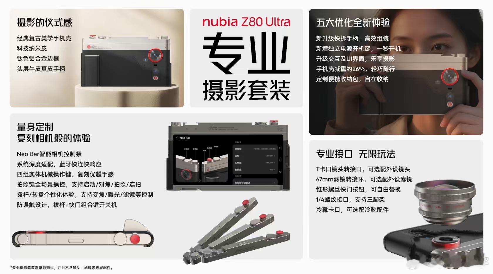 努比亚 Z80 Ultra专业摄影套装。从外观、操作、体验等方面全新升级。科技纳米皮、钛色铝合金边框、头层牛皮真皮手柄,打造温润细腻的质感。量身定制智能相机控制条,实体机械操作键、以及可自定义功能的拨杆和转盘。经典复古美学,相机般的操作体验,更快捷,更轻便,更多玩法,希望大家喜欢。