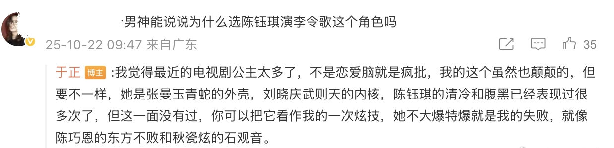 之后有网友在评论区问于正,为什么选择陈钰琪饰演这个角色?