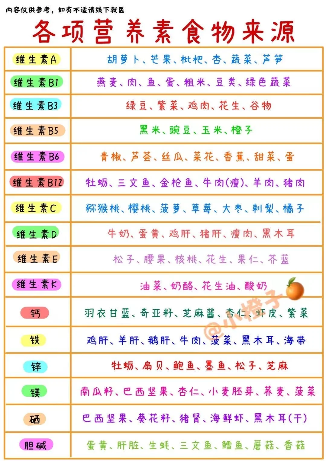 小橙子🍊整理了各项营养素食物来源,详情请查看图五哦~