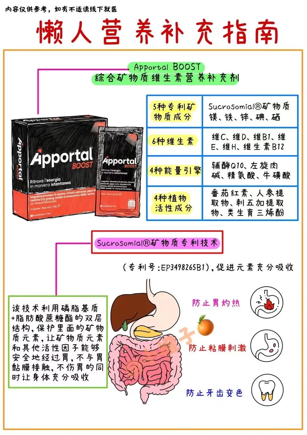 最让我心动💓的是它用了5种专利矿物质(镁、铁、硒、碘、锌这些),用的是Sucrosomial®技术(专利号EP3498265B1),能保护营养顺利过胃,吸收好还不刺激黏膜,不用怕被胃酸 “浪费”,吸收效率更在线,连我这种胃敏感的人吃了都没负担