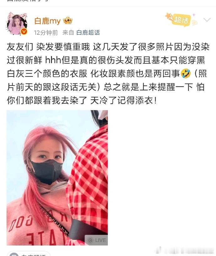 白鹿说染发要慎重哦白鹿提醒大家天冷了记得添衣白鹿提醒染发要慎重!说染发新鲜但伤发