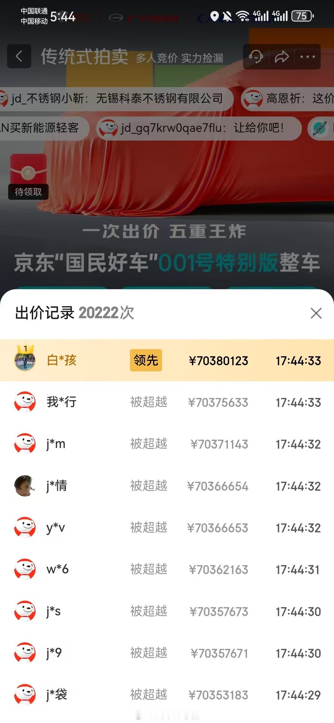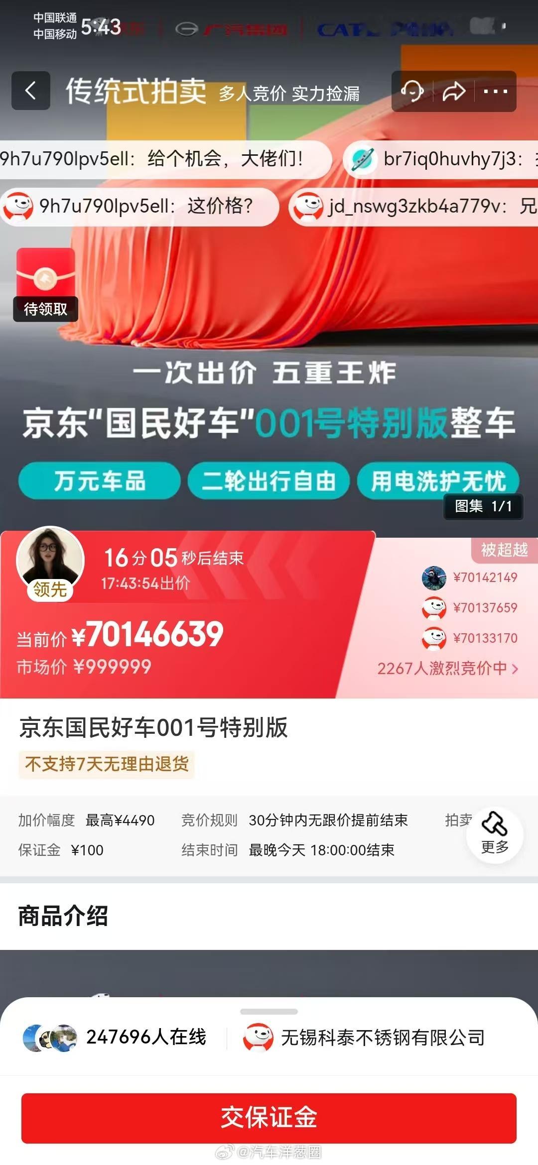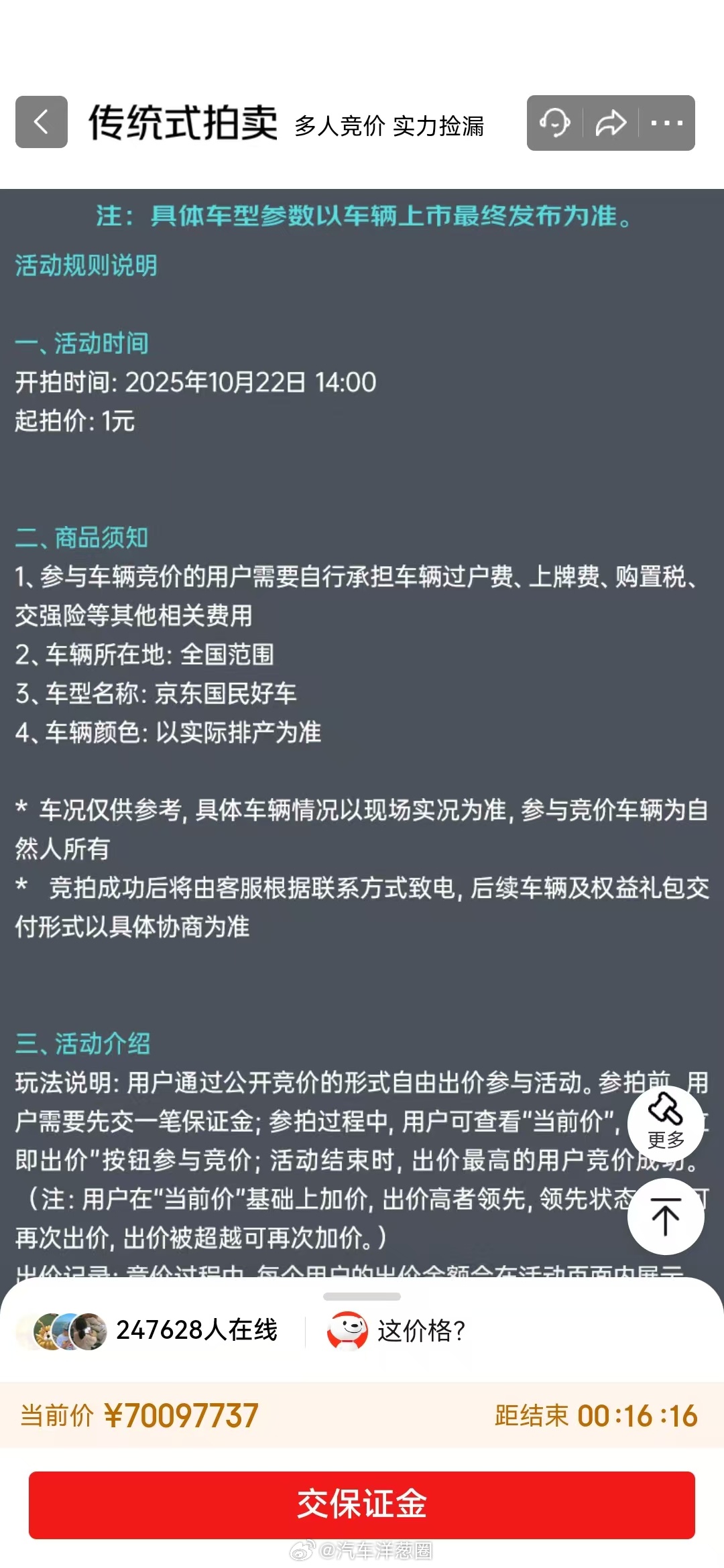 京东001号国民车20万人参拍下午17点45分那会,京东001号国民车的当前价已