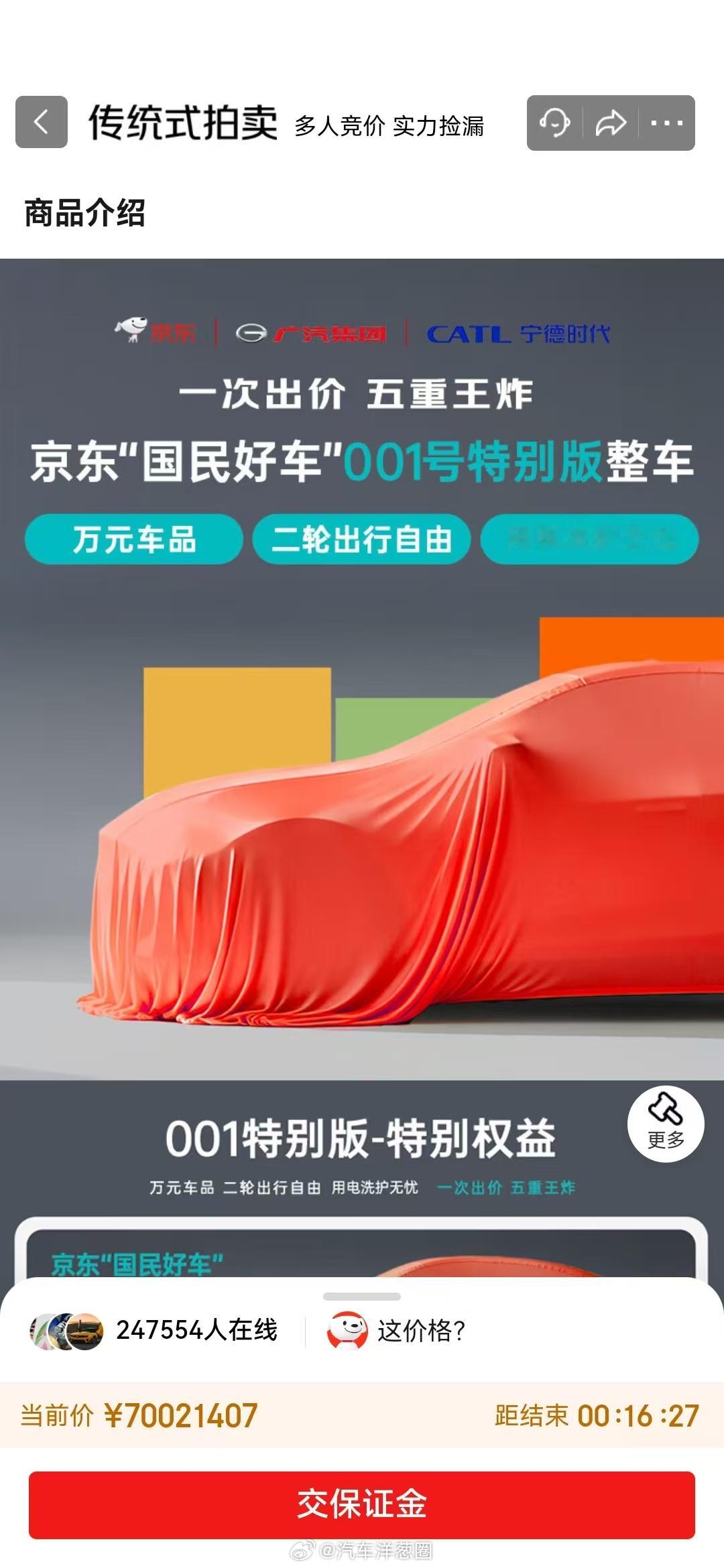 京东001号国民车20万人参拍下午17点45分那会,京东001号国民车的当前价已经给拍卖到“超7000万元”,超过24.76万人在线,出价记录超过2万次。