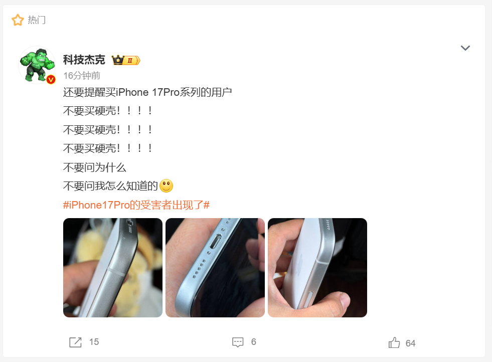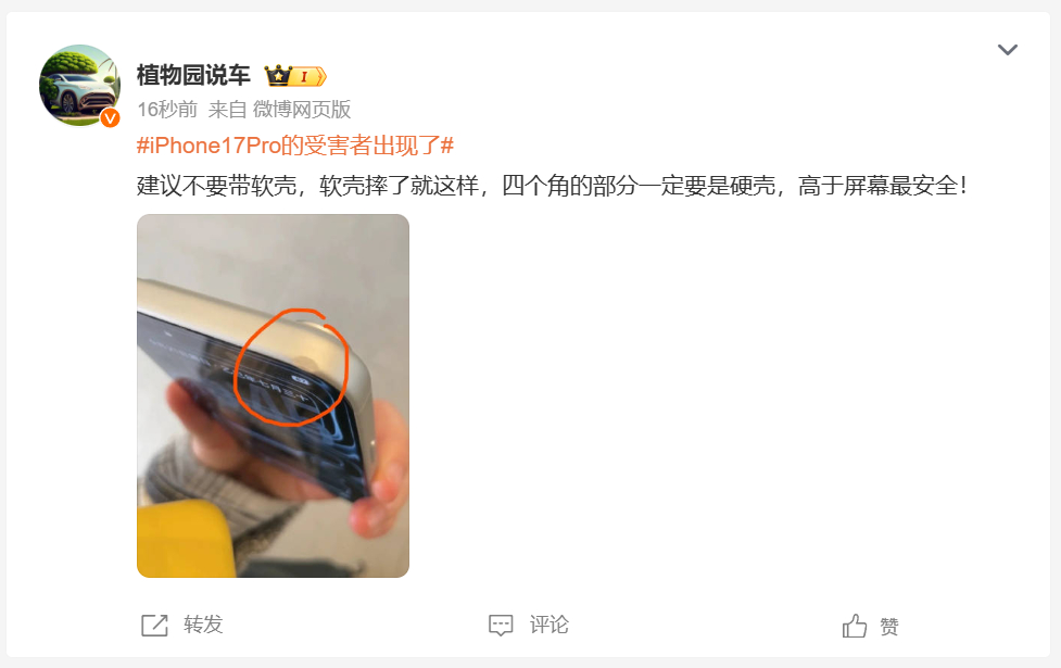 我也是首发用户,现在一点毛病没有,它毕竟是金属做的,不是橡皮泥做的…iPhone17Pro的受害者出现了
