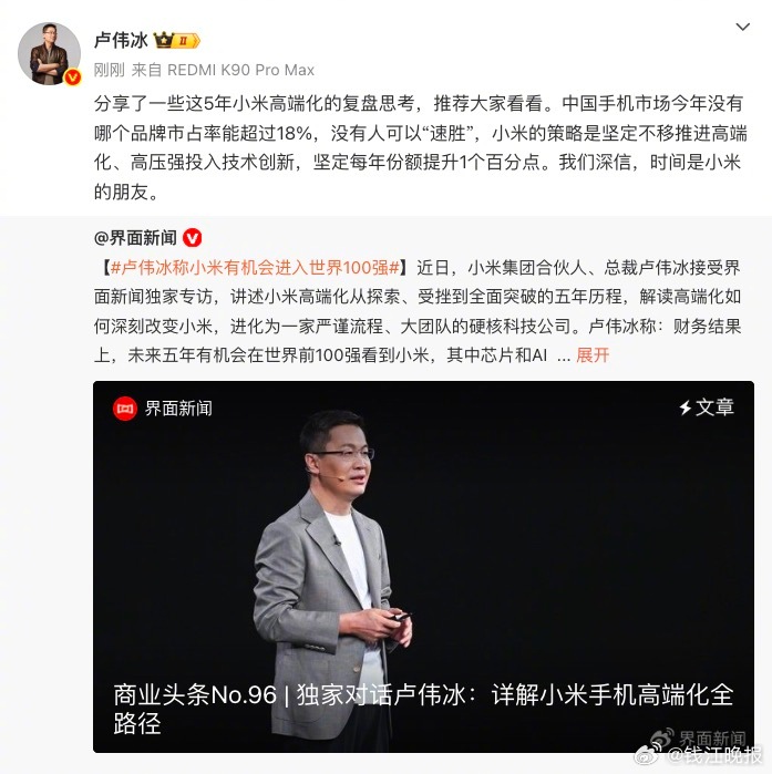 #卢伟冰称小米有机会进入世界100强# 近日,小米集团合伙人、总裁卢伟冰接受专访,分享了这5年小米高端化的复盘思考。卢伟冰表示,小米的策略是坚定不移推进高端化、高压强投入技术创新,坚定每年份额提升1个百分点。