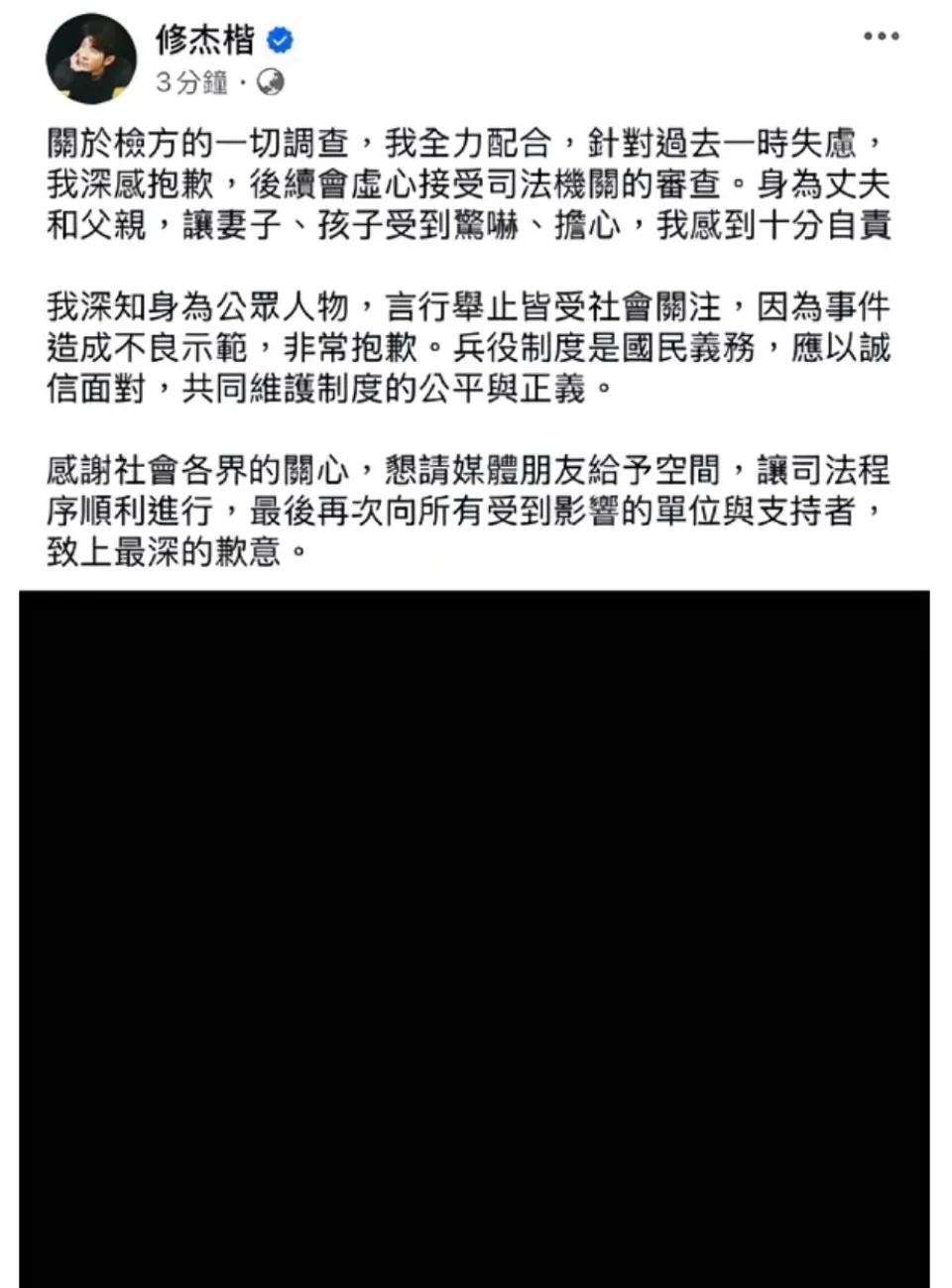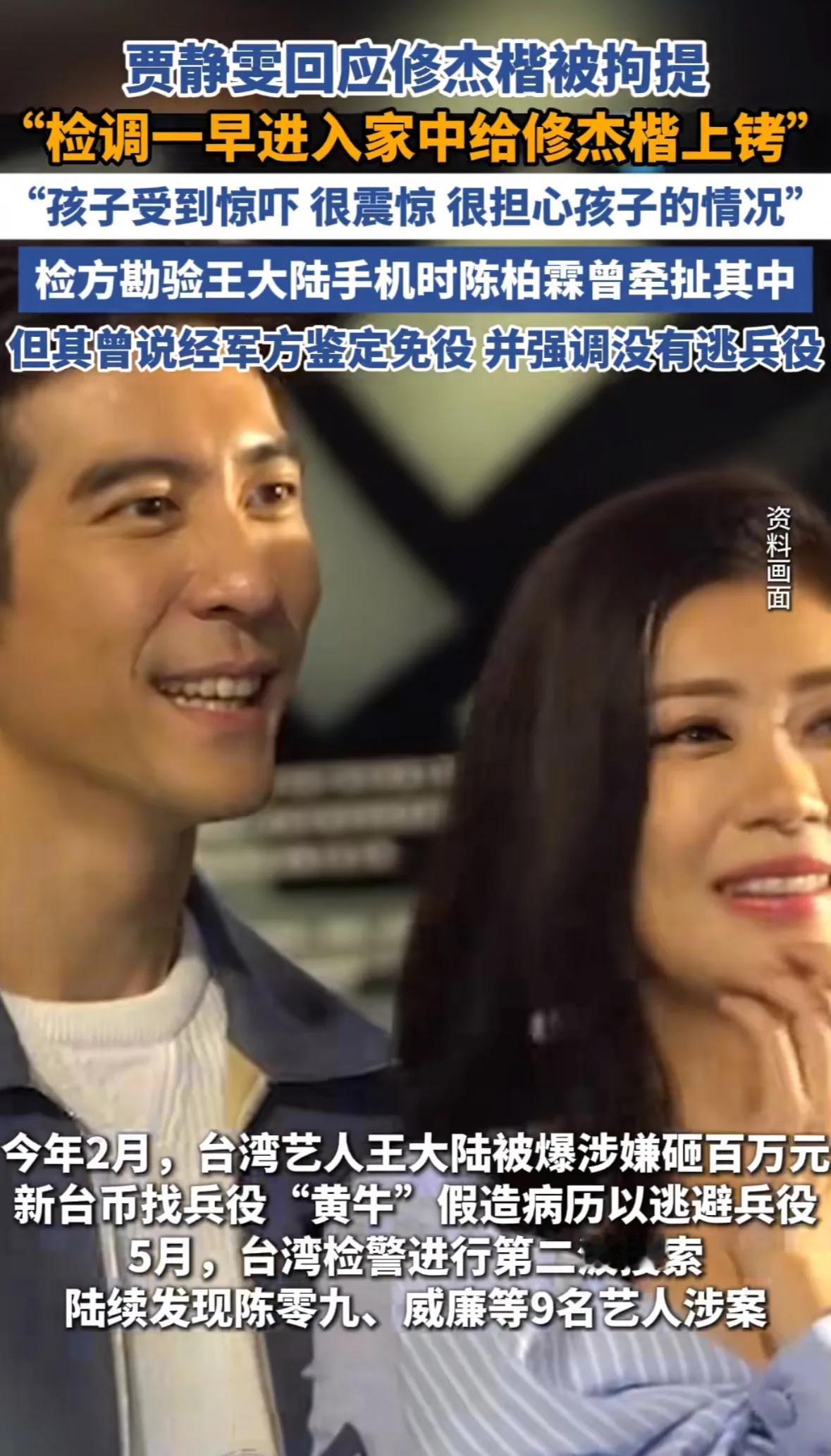 修杰楷当俩孩子面被拷走,“顾家好男人”变“逃役艺人”。 王大陆“闪兵案”持续发酵,艺人修杰楷10月21日遭警方拘提。贾静雯透过经纪公司回应,曝“爸爸修杰楷在孩子面前上铐”让两个孩子受到惊吓。对此,台湾省警方还原当时情况,称拘提修杰楷时,家中保姆开门,警方表明来意后修杰楷与两个孩子从房内走出。待得知情况后,保姆将孩子带回房内,警方让修杰楷换衣服,走出家门后,才在楼梯间上铐,并未让孩子目击上铐过程。 果然,艺人是知道怎么发言引导舆.情的,不解释为什么被拷反而突出孩子受惊吓…… 当日,修杰楷、陈柏霖等4人各以50万元新台币交保。陈柏霖在接受采访时供称“以10万元新台币伪造高血压”逃.兵.役,离开时说明会配合后续司法调查。 修杰楷则一身黑快步出警局,面对记者提问一概不答。随后修杰楷发文道歉,称会全力配合调查,身为丈夫和父亲,让妻子和孩子受到惊吓,感到十分自责。 仔细看了下,修杰楷是作假没完全成功,所以去的替.代.役,如果完全成功替.代.役都不需要去的。后来因为贾静雯怀三胎,几个月就出来了。 服.兵.役一去就是一两年,回来以后可能泯然于众人咯,谁会舍得?娱乐圈不见半年的话就要查无此人了,林志颖算是第一个逃离魔.咒的,可不是谁都能像他一样,所以大家逃的套.路也是五花八门,只是被发现还是没被发现罢了。