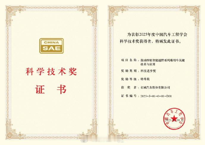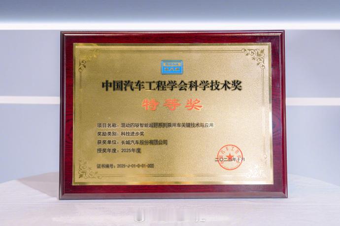长城Hi4获科技进步奖特等奖长城汽车Hi4混动四驱技术体系荣获2025年中国汽车工程学会科学技术奖“科技进步奖特等奖”,这是该奖项设立30余年来首次颁发给混动技术,标志着中国在混动领域的重大突破。
