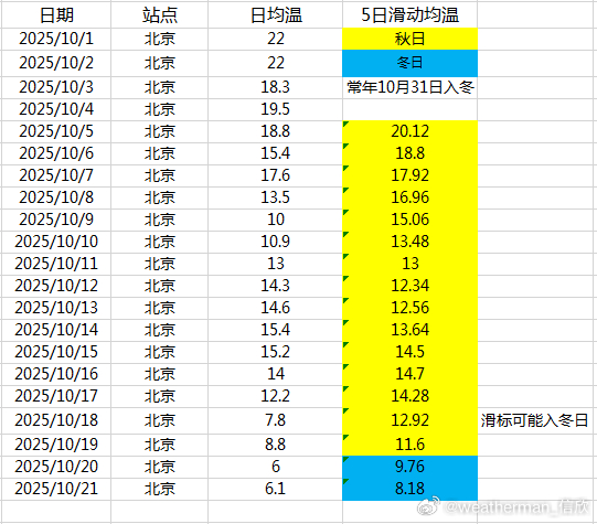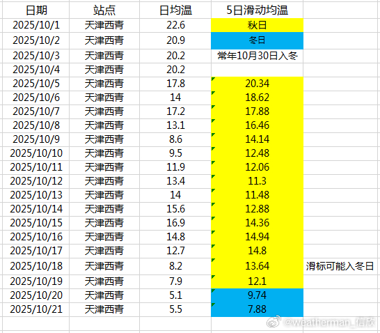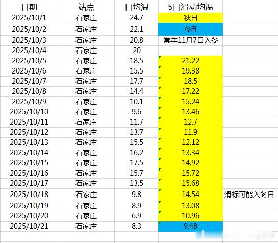 石家庄在10月1-2日均温还在22℃以上,单日夏日,还在穿短袖。转眼10月10日就是冬日。天津类似,10月1日夏日,10月9-10日冬日。随后气温稍有反弹,但18日气温又明显下降,感觉没有秋天就入冬了。