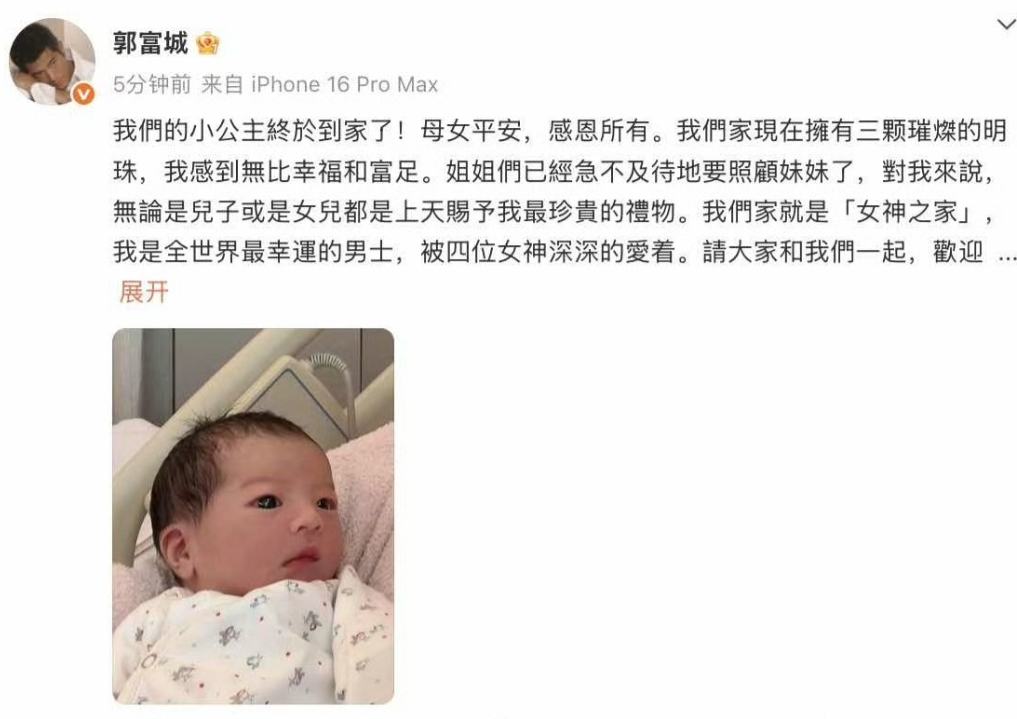 郭富城官宣生女! 今天晚上,郭富城在自己的社交网络,官宣了自己的第三个宝贝女儿
