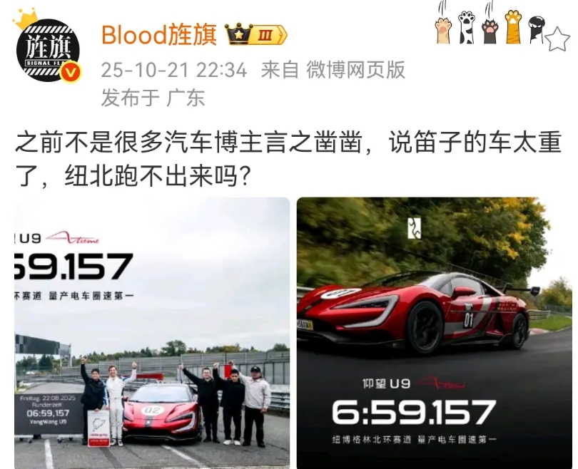 艹老师:之前不是很多汽车博主言之凿凿,说笛子的车太重了,纽北跑不出来吗? 仰望U9纽北圈速超过小米!成为全球跑得最快的量产电动车! 仰望U9的这个成绩不含任何的定语,小米此前的成绩是全球最速四门,仰望U9的这个成绩直接是最快量产车。 各位是怎么看的?欢迎评论区留言。