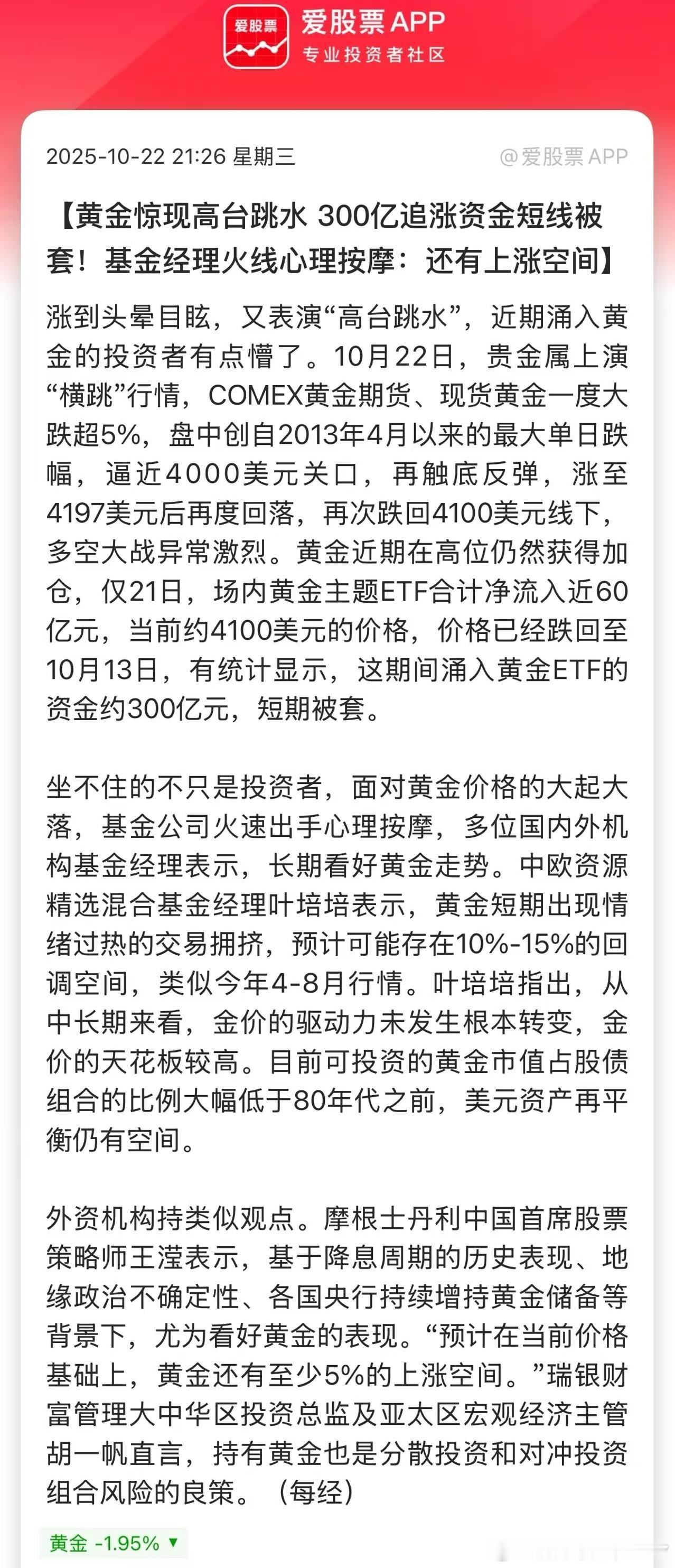 黄金惊现高台跳水300亿追涨资金短线被套!