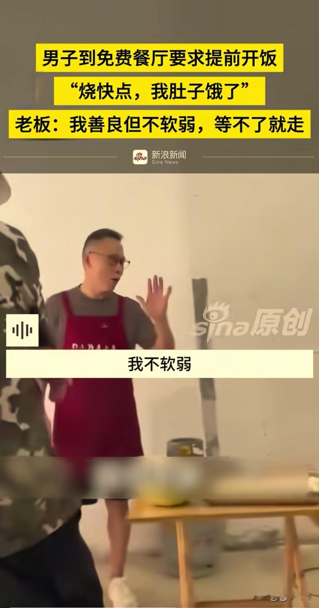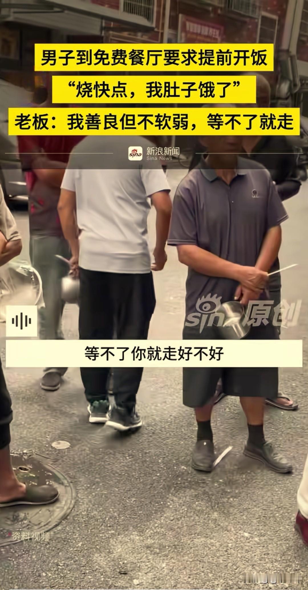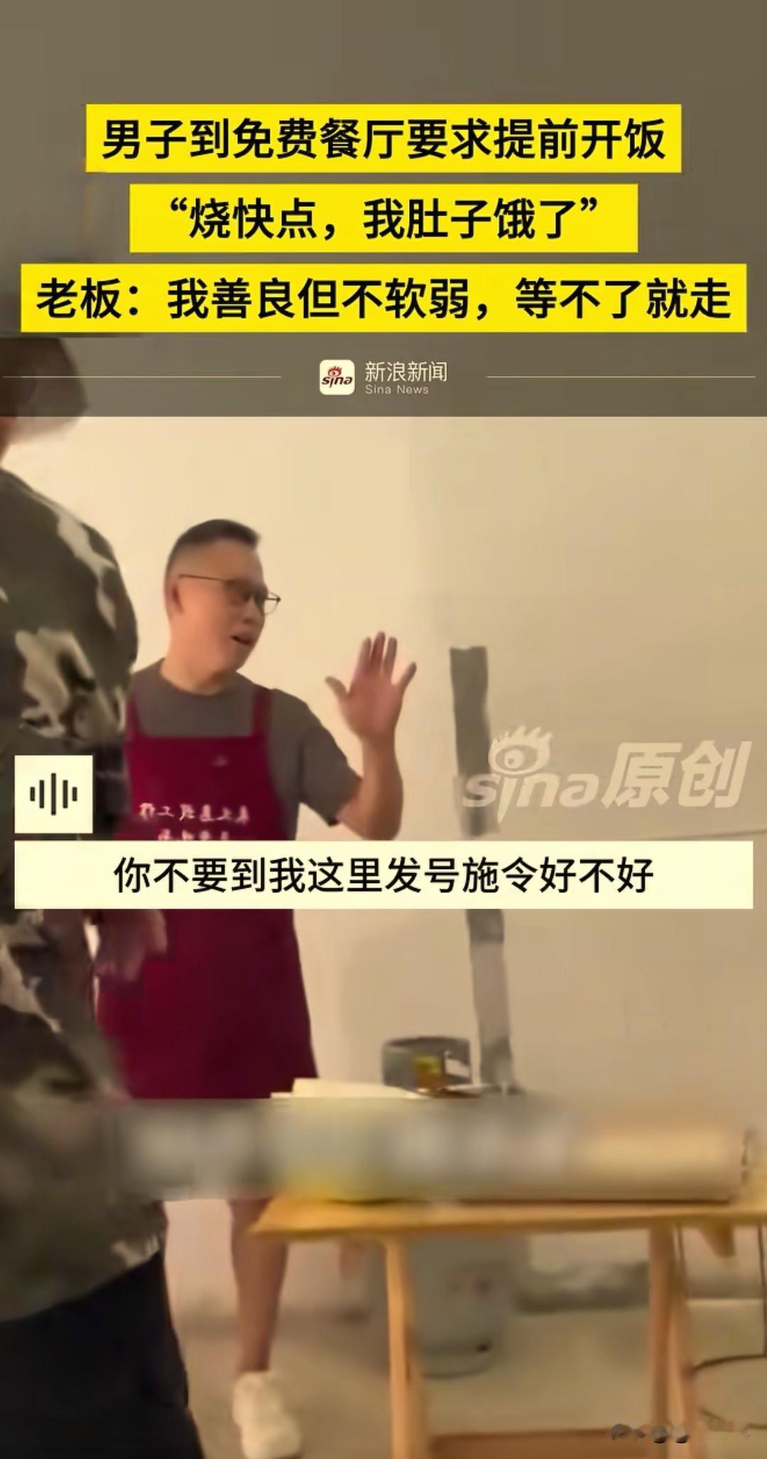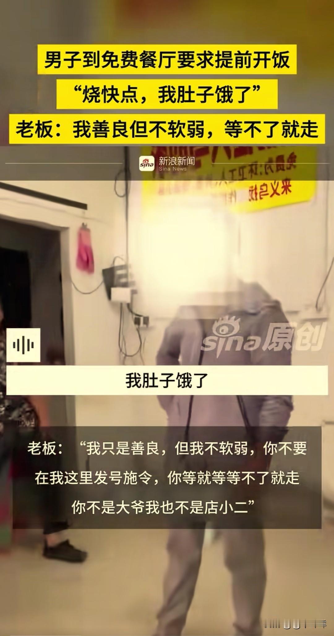 别把别人的善良当成理所当然!近日,一男子冲进一家免费餐馆里,大声并不耐烦催促老板:“烧饭快点,我肚子饿了!” 男子向旁边的人大吐苦水:“他们讲10点就吃饭,怎么到现在都还没有开饭,我都饿着了,搞快点。” 原来杨先生的饭馆是为环卫工人、快递小哥和来义乌找工作暂时没有着落的人提供免费吃食的,属于临时救助性质的,在当地很有名。 男子一进门就大声喊开饭,并且索要垃圾袋。杨先生拒绝后,他擅自拿走垃圾袋,被杨先生追回。 杨先生耐心地对着男子说 : “兄弟,我只是善良,我不软弱,你不要到我这里发号施令好不好,你等就等,等不了你就走好不好。你不是大爷好不好?我也不是店小二!哪怕饭店也有开饭点。” 男子情绪失控,事后也向杨先生道歉,赢得了杨先生的原谅。但此事还是在网上引发关注,善良要有边界,慈善也需要尊严。老板好心为他们提供吃食,换来的是理所应当的指责,怎么不让好心人寒心?要时常怀一颗感恩之心!