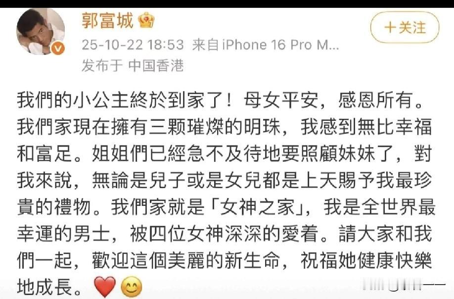 郭富城此刻估计有点失落吧!郭富城官宣三胎得女。儿子梦碎了! 在此之前,郭富城和妻子方媛已经先后生下两个小公主。 自从方媛在社交平台上公布三胎喜讯后,各种议论就没有断过。 有的网友说,方媛肚子里是儿子,郭富城甚至取消她的副卡限额,待遇比怀前2胎高得多。 有的网友说,郭富城打断了四大天王的岳父命,一举得男!从今往后,更有干劲了!因为偌大的家业有儿子继承了。 有的网友说:好心疼,天王儿子梦碎了! …… 其实要我说,也许人家根本没有在意到底是生儿子还是女儿,只要是自己的,儿子女儿都好! 你看从他发文就可以看出,对于这个老来女,他还是很喜欢的!正如他自己写的,无论是儿子还是女儿,都是上天赐予他最珍贵的宝贝!他是最幸运的男士,被4个女神爱着! 要我说啊,三个女儿也好,以后能带来3个儿子,就是不知道哪三个臭小子有福了! 话说回来,天王就是天王,基因真是没法说!你看这个刚出生的这个小宝宝真是漂亮啊!水汪汪的大眼睛,红扑扑的小脸蛋,让人一看就很喜欢。