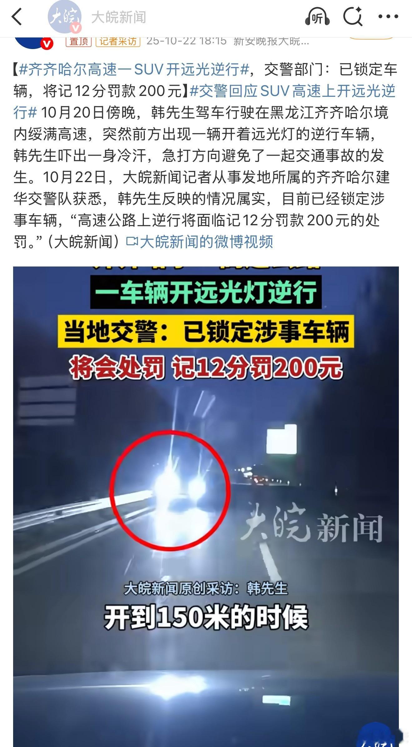 齐齐哈尔高速一SUV开远光逆行高速+开远光+逆行,这是一点交通法规都不在乎了啊,还好是没出什么事故,要不然毁的可不止一个家庭。