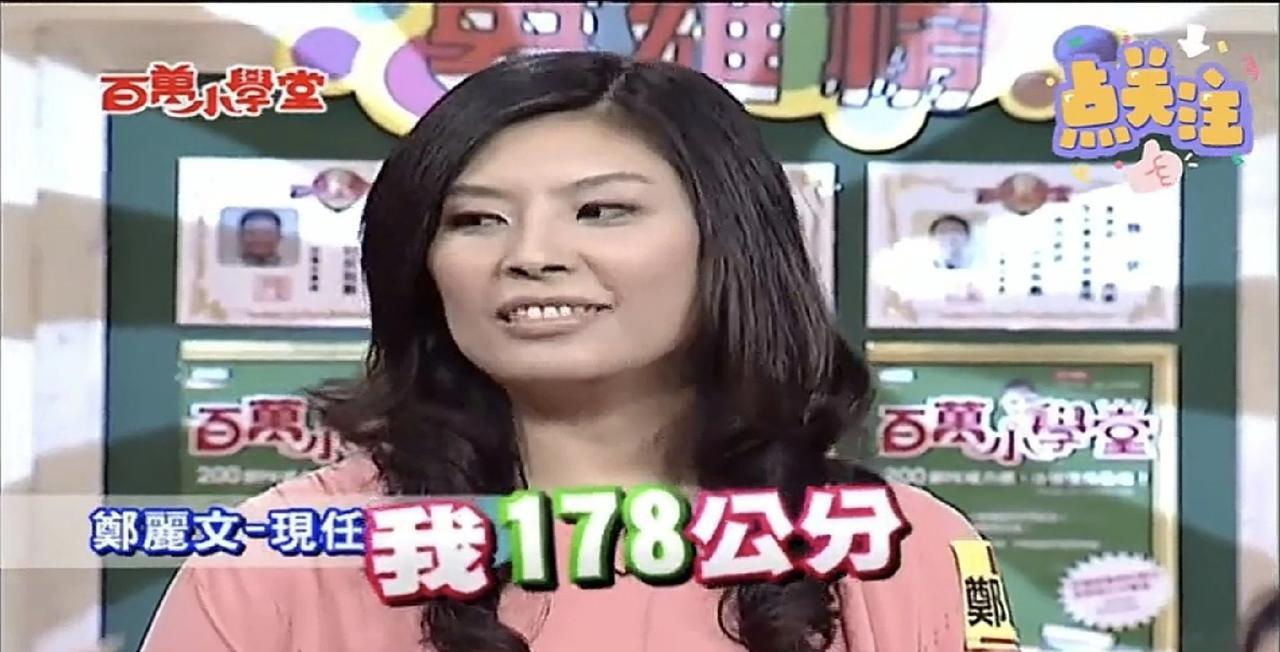 郑丽文身高178公分,这是她2008年上综艺节目时亲口说的,她说她念大学的时候是176公分,后来又长了2公分。据说马英九身高也是178,但看起来郑丽文明显比他还高一点,不知道是不是老马哥年老体衰身高萎缩,亦或者郑丽文穿了高跟鞋。