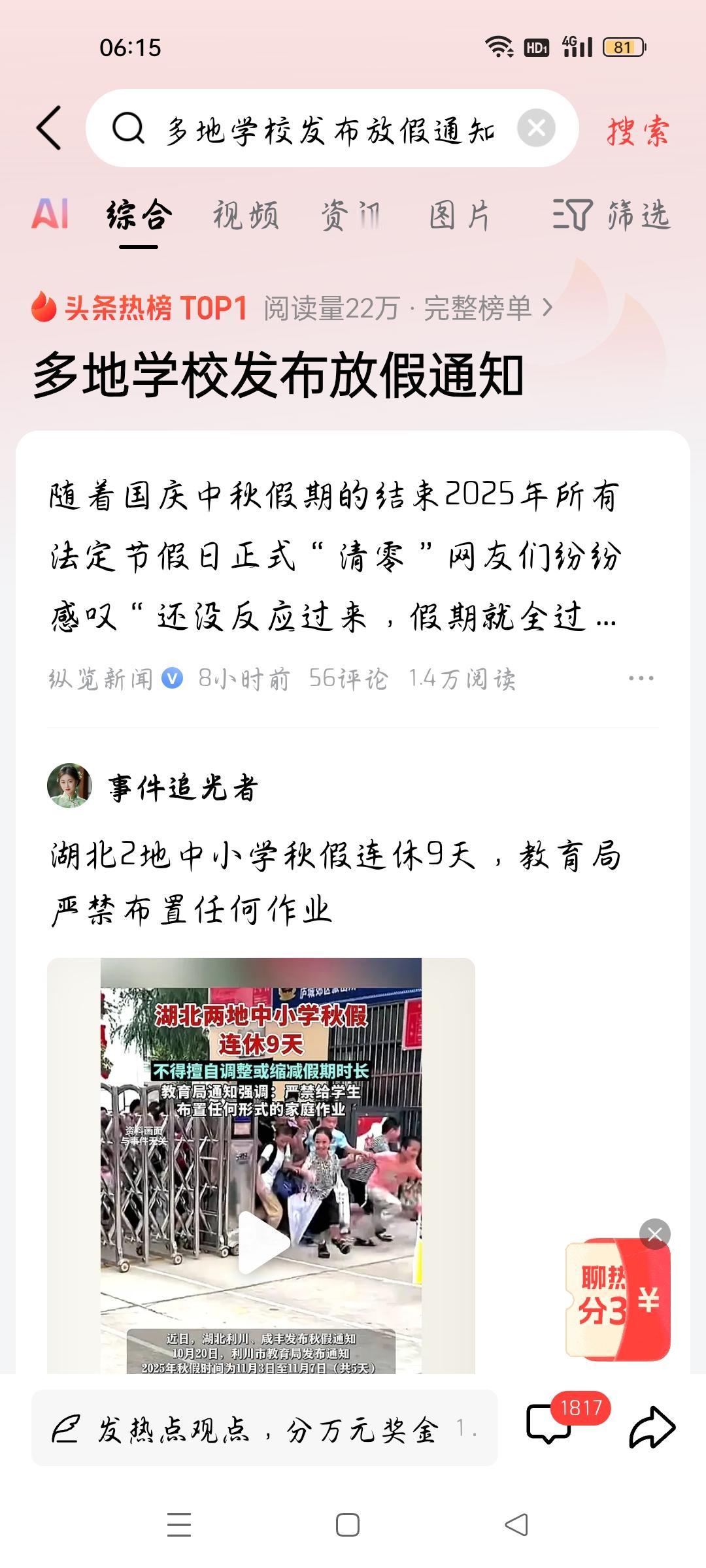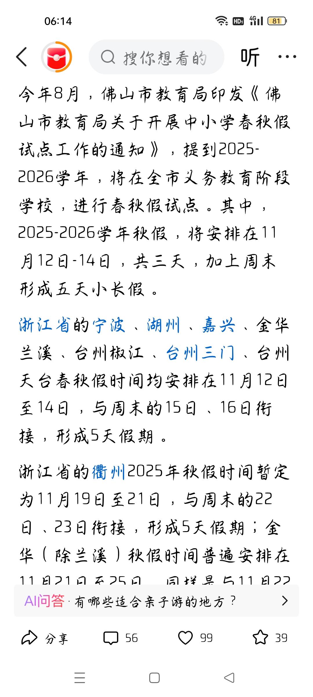 多地发布放假通知,我想说 据纵览新闻报道,随着国庆假期结束2025年法定假期全部清零,可是多地教育部门发布放秋假通知,例如广东佛山、浙江的宁波、湖州等地试行放秋假,教育部门放秋假的目的是让学生在紧张的学习中放松一下,劳逸结合,同时也有利于推进亲子游,不过个人认为,学生放假,家长假如要上班,去旅游,办不到。个人认为对广大农村学生不如在农忙放几天假,让学生体验一下农忙生活,有利于贯彻德智体美劳发展。各位条友觉得呢?