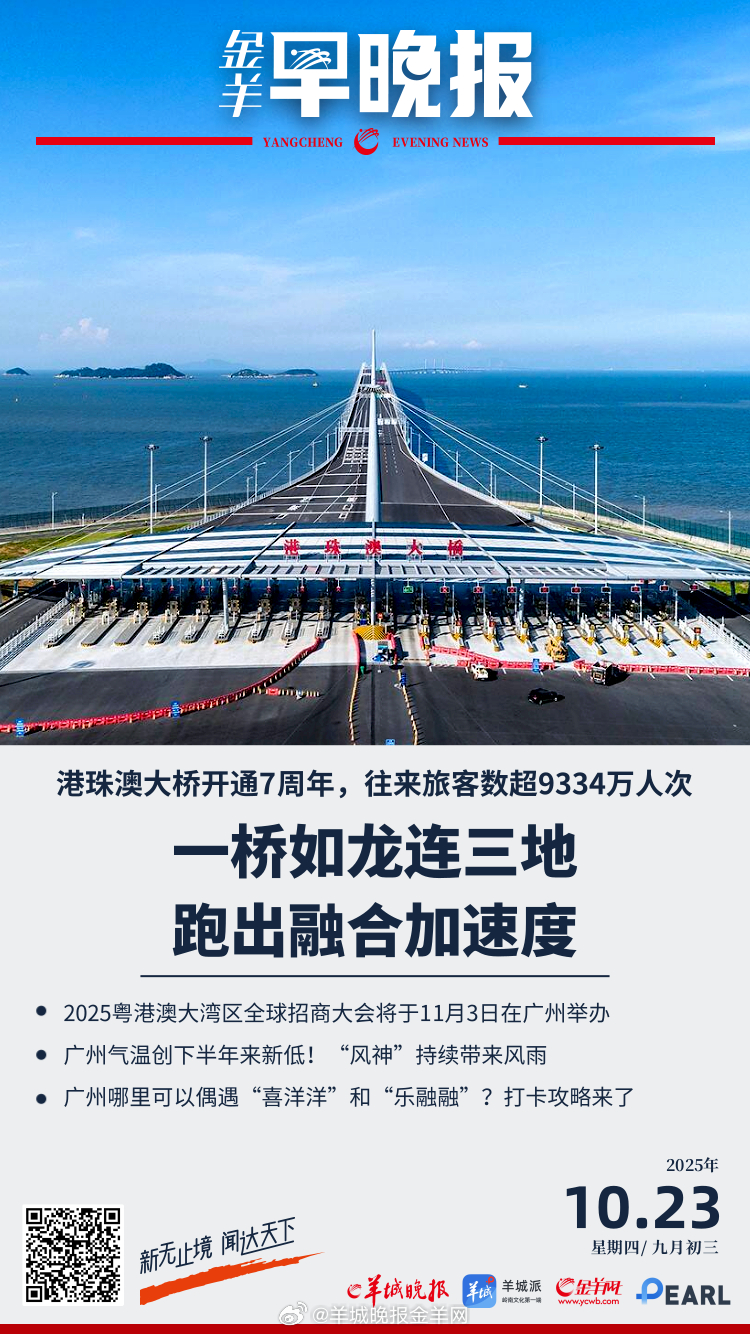 #金羊早晚报#一桥连三地,港珠澳大桥开通7周年跑出融合“加速度”;“多管局局长”火了,官方回应;十五运会广东U18男足绝杀挺进四强;“潮汐厕所”解决景区如厕难,其背后的决策思路更值得推广;记者走访广州黄沙水产交易市场:零售档有序经营,批发业态档铺已搬离;2025粤港澳大湾区全球招商大会将于11月3日在广州举办;冰岛首次发现蚊子,暖水海域的鲭鱼也来了;广州哪里可以偶遇“喜洋洋”和“乐融融”?打卡攻略来了!#中方回应朝鲜发射多枚弹道导弹#更多精彩报道,请扫码关注羊晚全媒体报道!