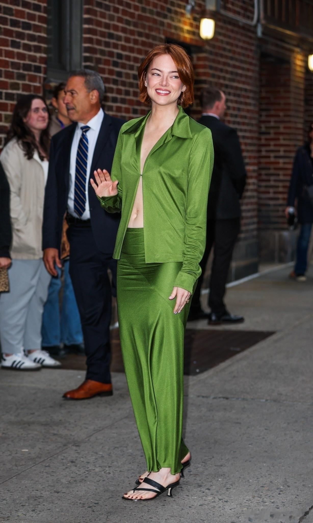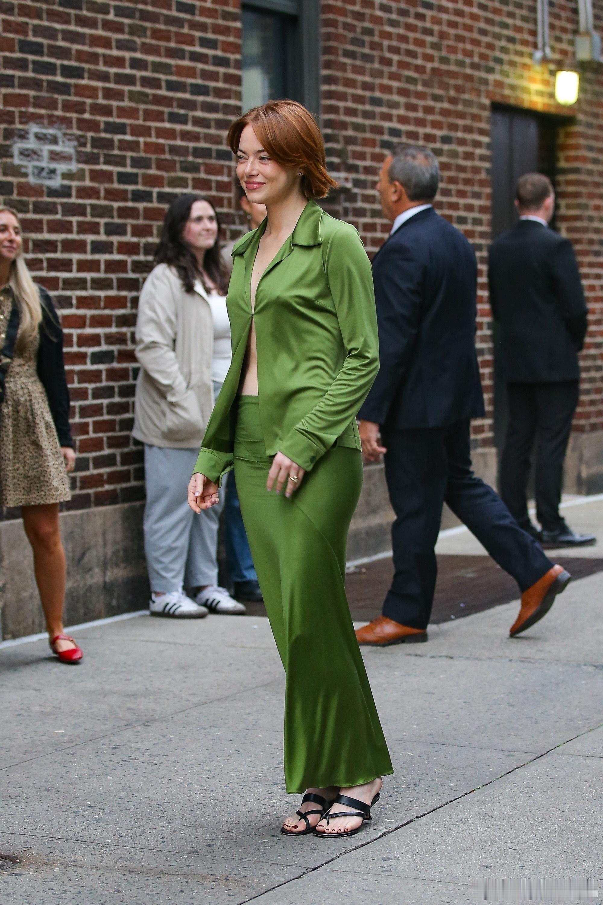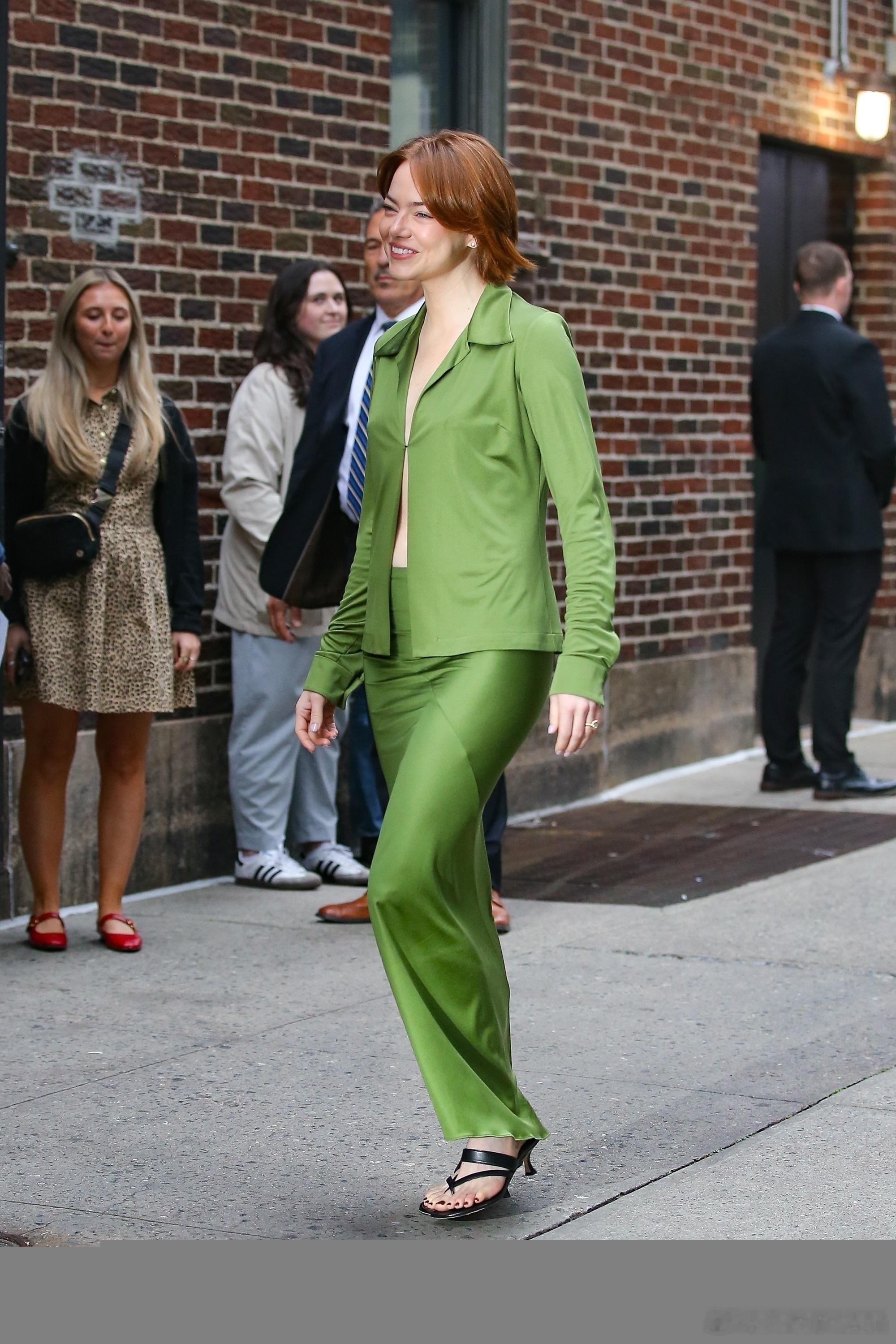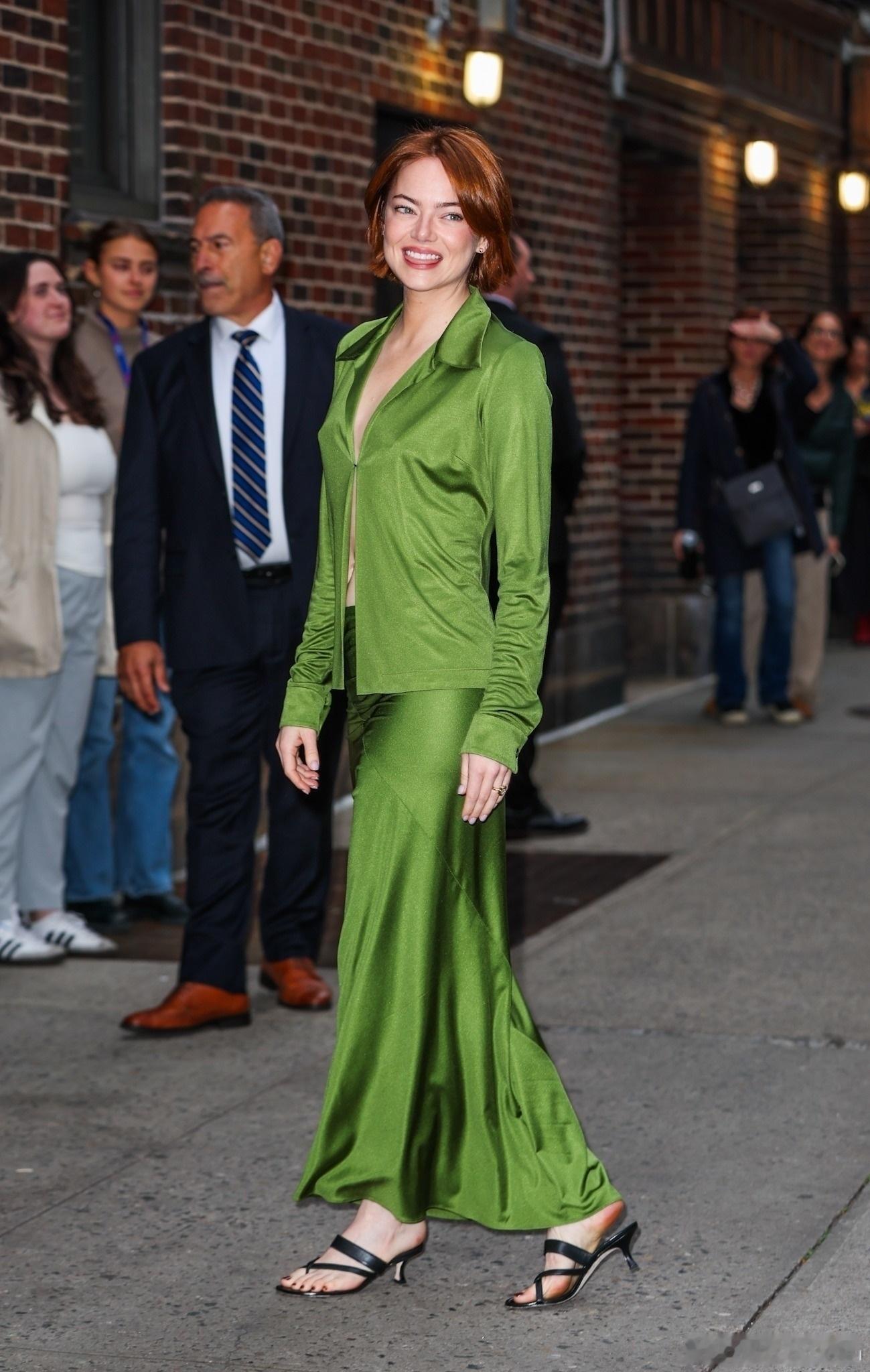 Emma stone艾玛斯通在纽约外出前往做客《The Late Show With Stephen Colbert》节目,石头身着绿色缎面裙装,人群里相当抢眼