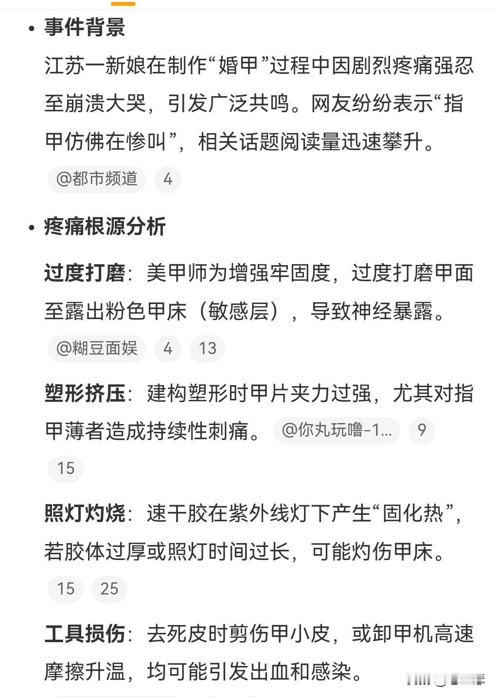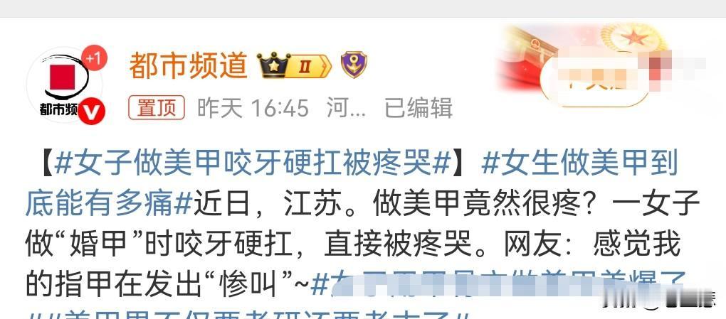 难道做美甲这么疼的吗? 我也经常看别人做美甲,经常路过也没发现她们有这么痛啊,一新娘做美甲痛哭还惨叫。 还咬着纸巾,感觉像是遭受了虐待一样。 这种痛肯定是不专业导致的。 这是不应该出现的。美甲怎么能够把人给做痛呢?这真的很不专业,这个美甲就没必要做了。 况且美甲也是对指甲的伤害很大。 犯不着为了美而做指甲。