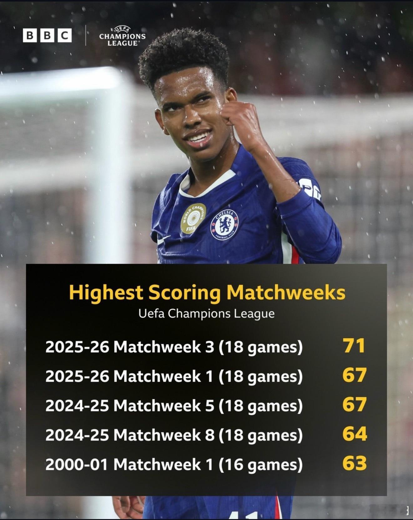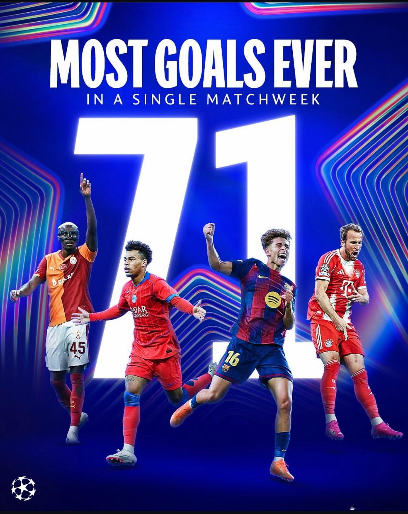 在此之前欧冠单轮进球数纪录是67粒。这个数字在本赛季欧冠第1轮和上赛季第5轮中出现过。