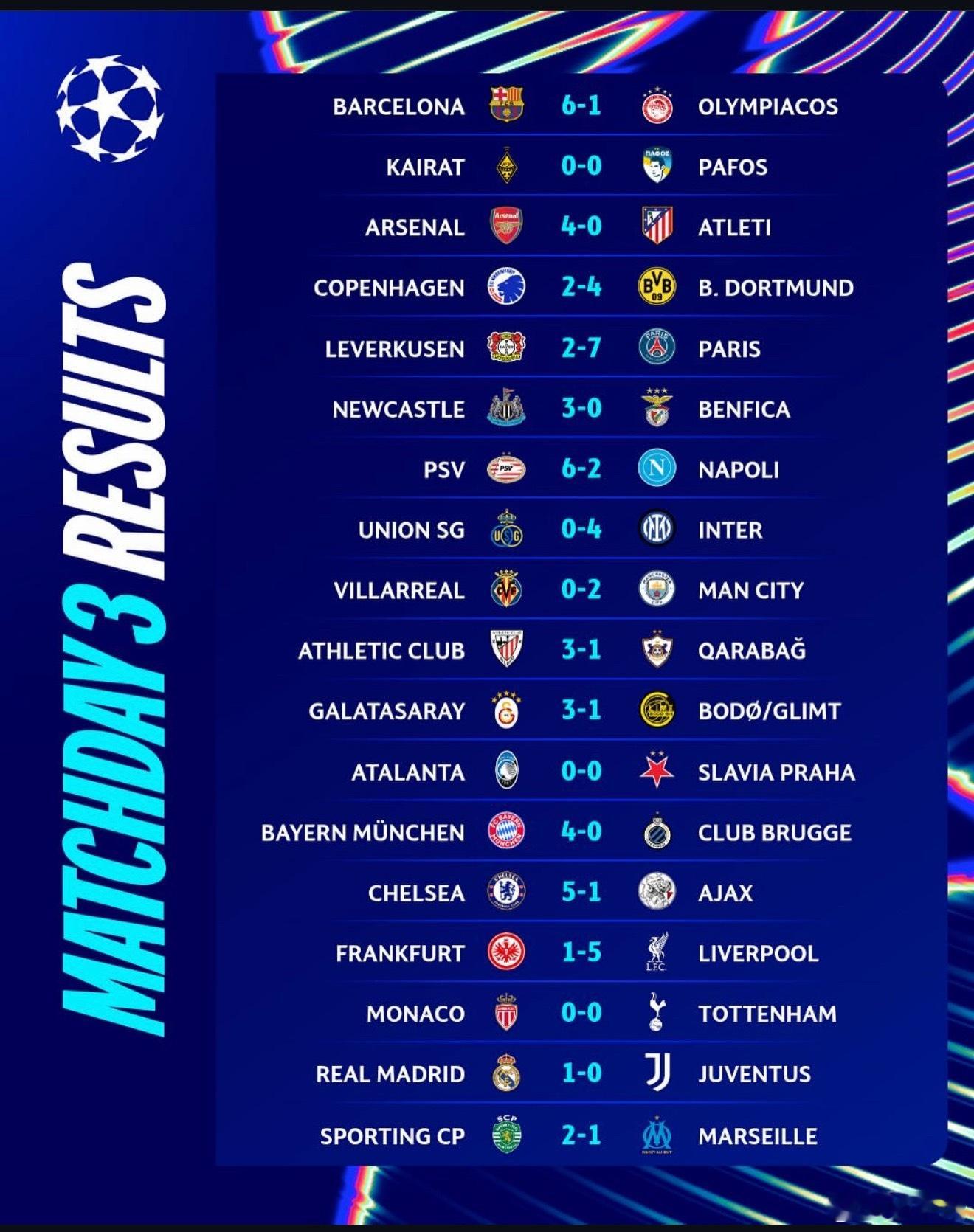 本轮欧冠,单场进球超过6个的比赛就达到6场。也有3场比赛上演0比0平局。