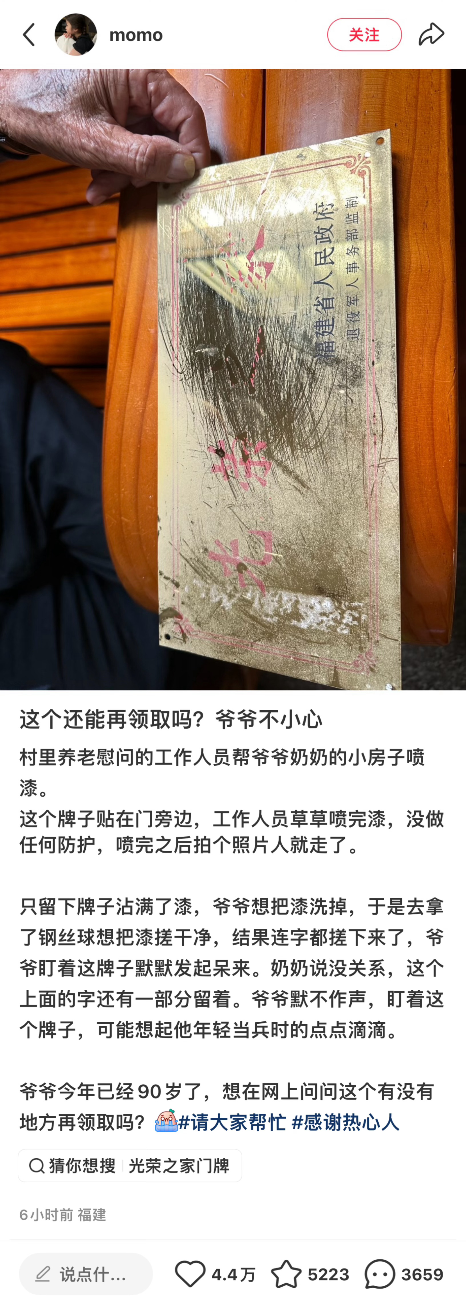 你是说,基层工作人员上门慰问90岁老兵,把人家的“光荣之家”牌匾喷了一堆去不掉的漆,就拍拍屁股走人??要人家90岁老爷爷的孙女上网发帖问怎么处理???